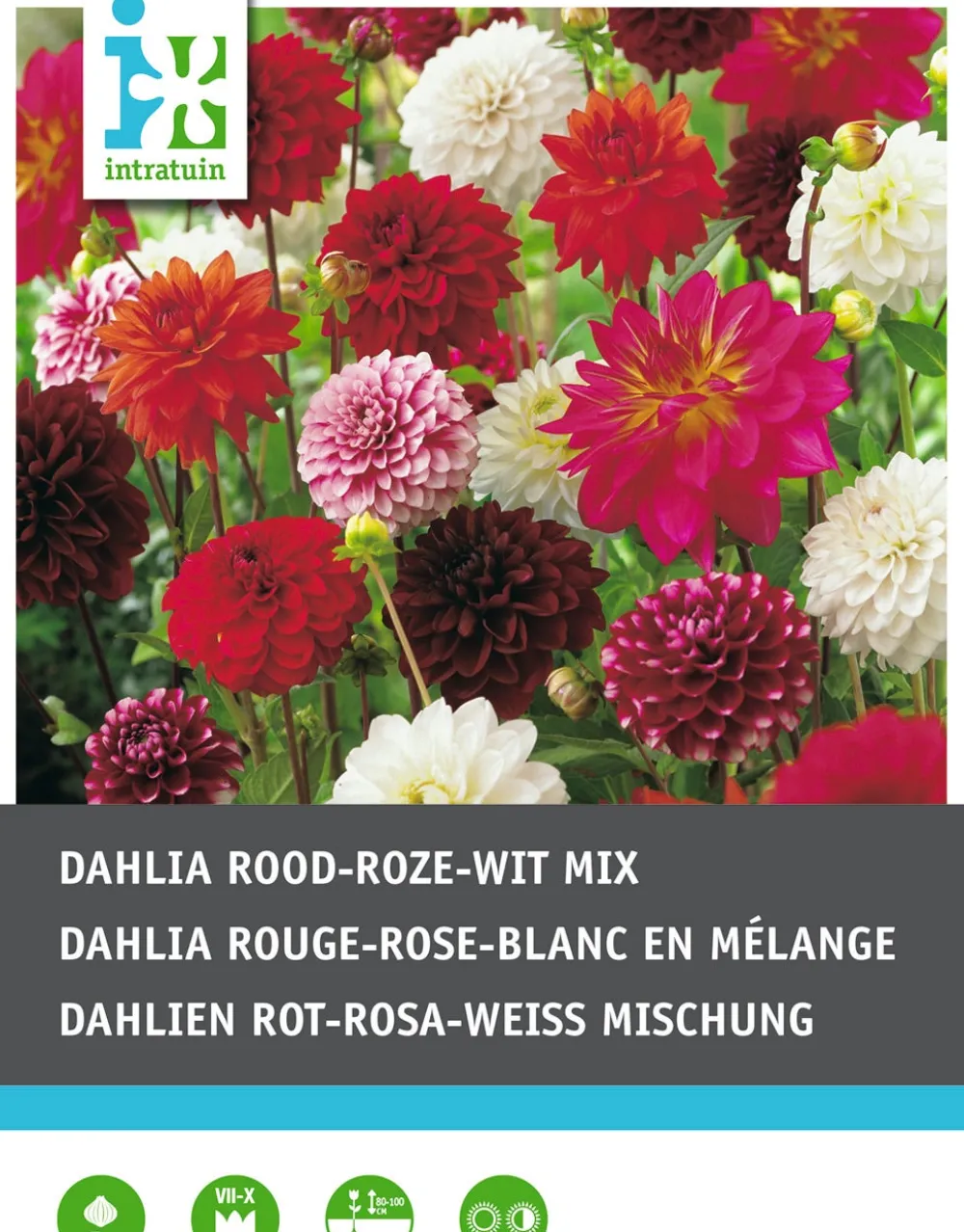 Die Dahlie gibt es in vielen Sorten. Es gibt Arten, die niedrig bleiben, aber auch solche, die während einer Saison bis zu 6 Meter hoch werden können. Die Dahlie ist eine Knollenpflanze: Nach der Blüte sterben die Blätter ab. In einem milden Winter kann die Dahlienknolle in der Erde überleben. Bei unseren Wintern ist es aber ratsam, die Knolle im Herbst auszugraben und trocken und kühl zu überwintern. Die Arten, die wir normalerweise in den Garten setzen, sind sehr dekorativ mit ihren großen Blüten, die mit ihrer hellen Farbe zwischen den dunkelgrünen Blättern schön hervorstechen. Diese Dahliensorte blüht rot, weiß und rosa. An der Blüte kannst du erkennen, wie zufrieden deine Dahlie mit deiner Pflege ist.