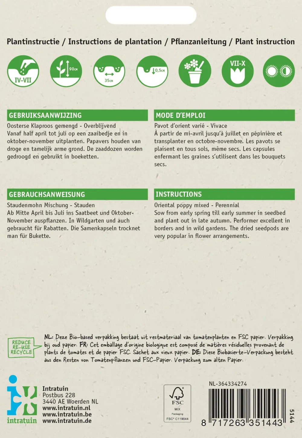 Dieser Mohn blüht gemischt in Orange, Rot und Rosa. Du kannst ihnvon Mitte April bis Juli im Freien in ein Saatbeet säen und im Herbst ins Beet pflanzen. Diese Staude blüht ab dem nächsten Frühjahr im Mai oder Juni mit großen Blüten und entwickelt dann dekorative runde Samenkapseln. Diese Pflanze ist winterhart und bildet große, behaarte Blätter, die schön eingeschnitten sind. Im Winter stirbt die Pflanze oberirdisch ab.
