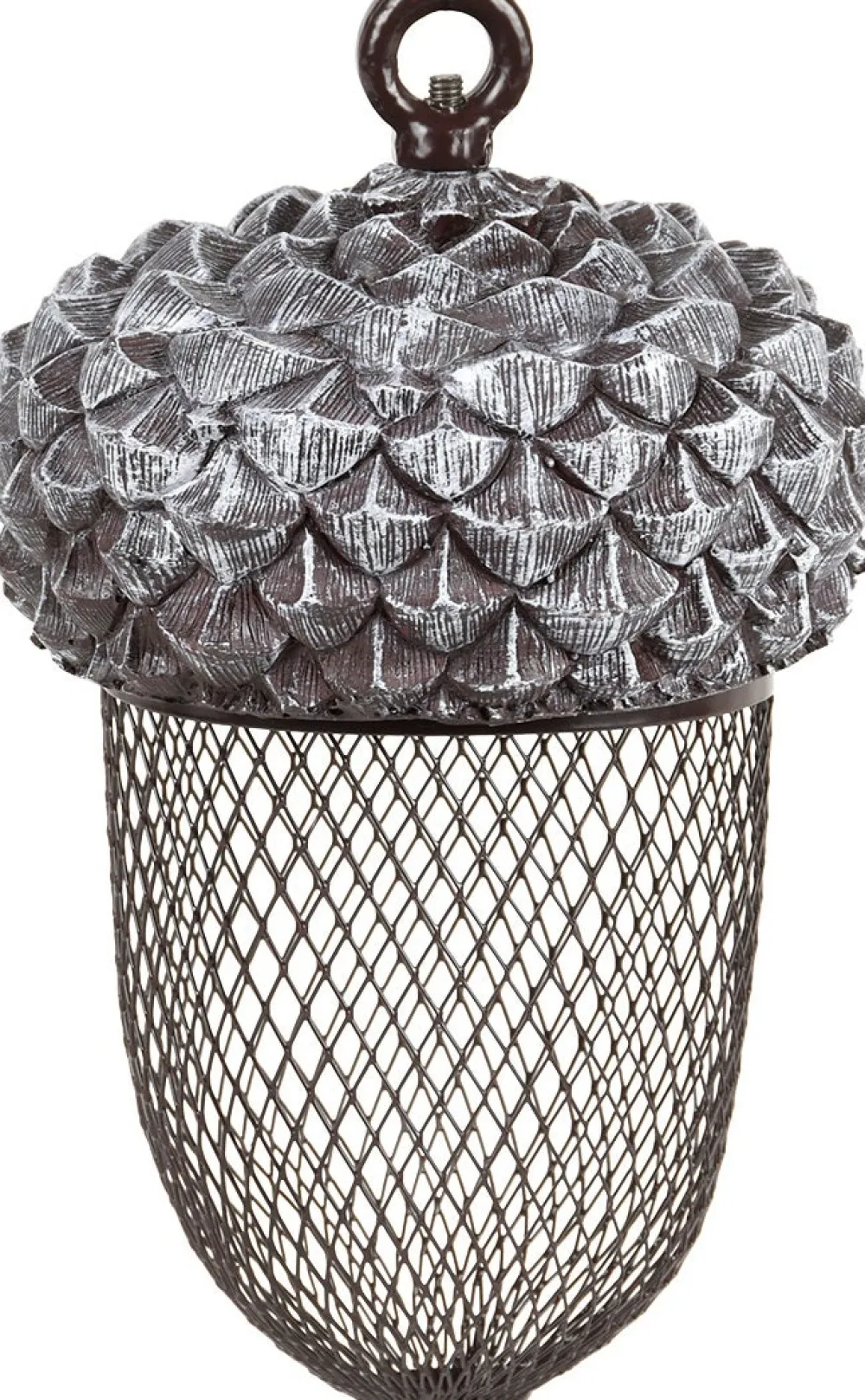 Das Vogelfutterhaus ist aus Eisen gefertigt und hat eine offene Struktur, so dass die Vögel das Futter von allen Seiten erreichen können. Der Durchmesser der Eichel beträgt 14 cm und die Höhe ist 22,2 cm.