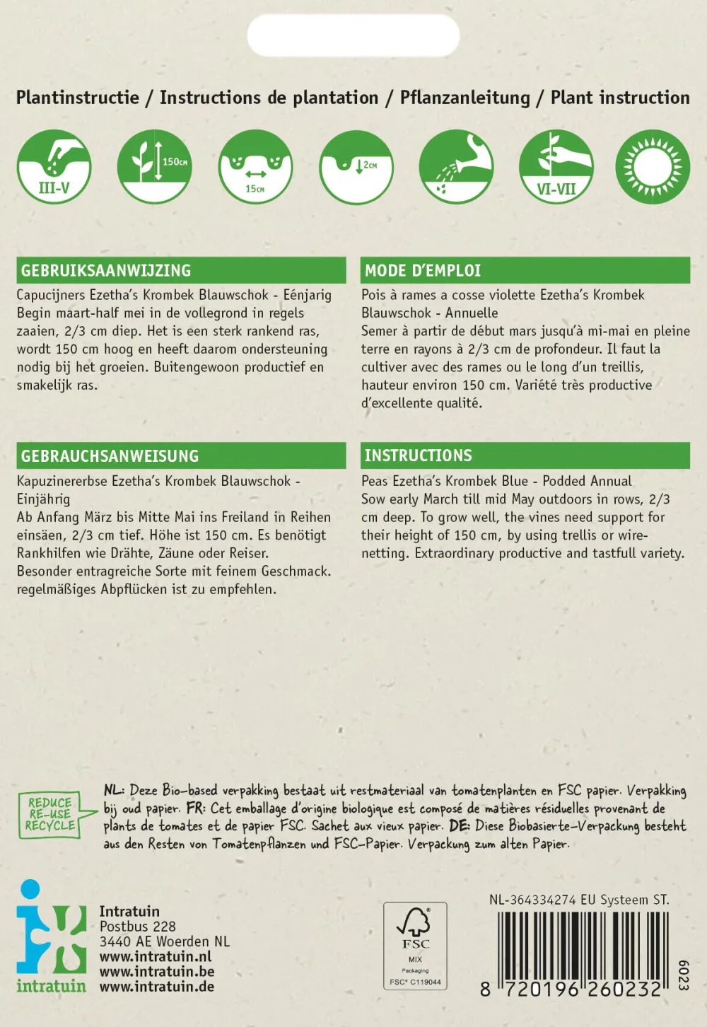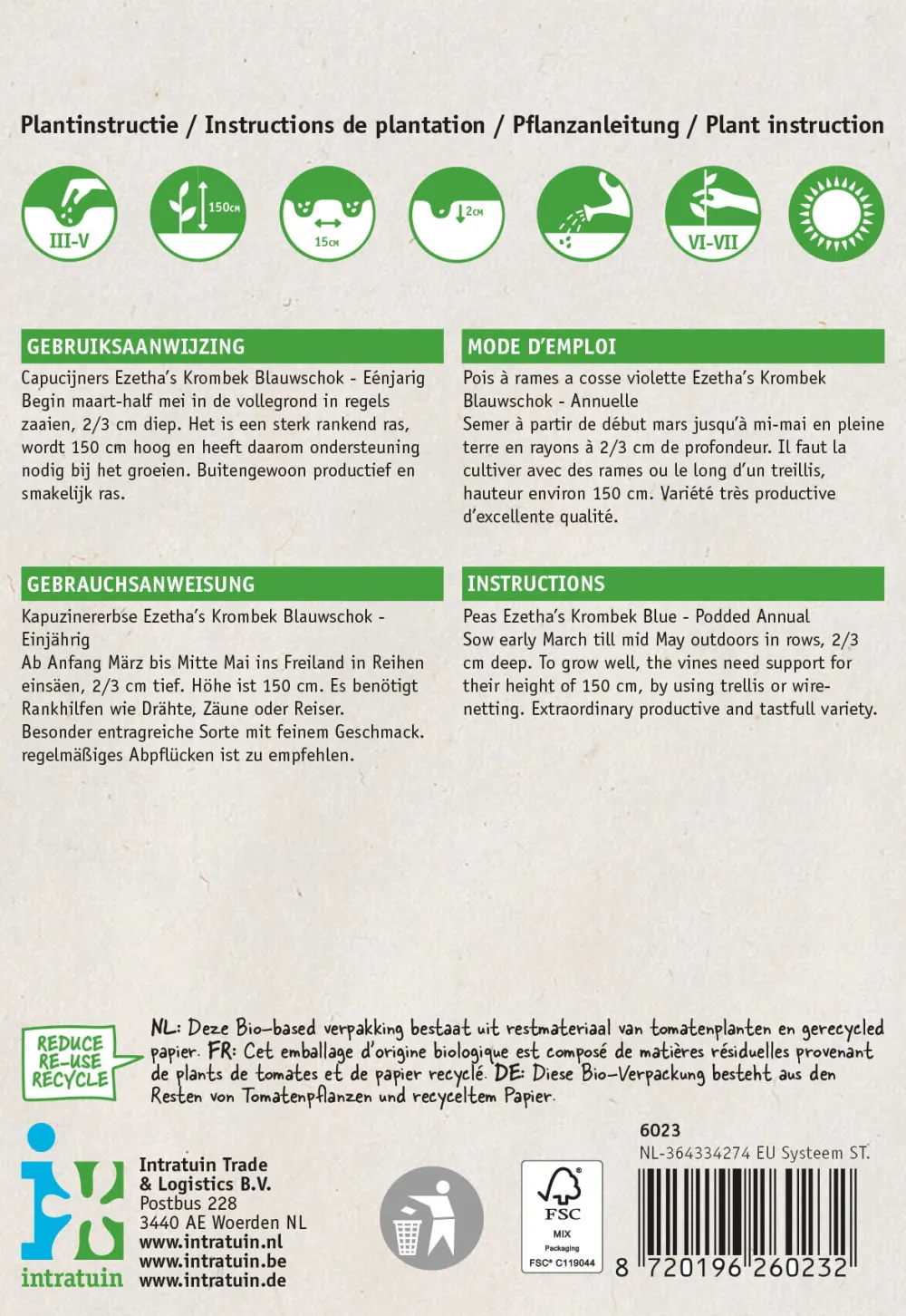 | Botanischer Pflanzenname | Pisum sativum ‚Ezethe’s Krombek Blauwschok‘ |
