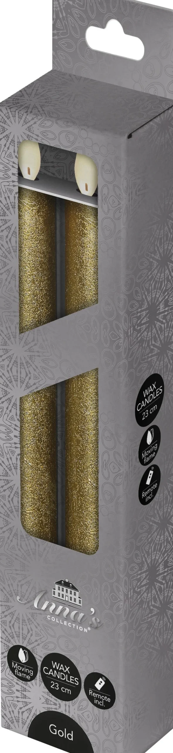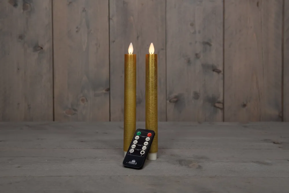Diese 2 Stabkerzen haben LED-Lämpchen und lassen sich bequem mit der mitgelieferten Fernbedienung ein- und ausschalten. Die LED-Stabkerzen in der Farbe Gold sind batteriebetrieben, haben eine bewegliche Flamme und sind 23 cm lang. Erhältlich in verschi