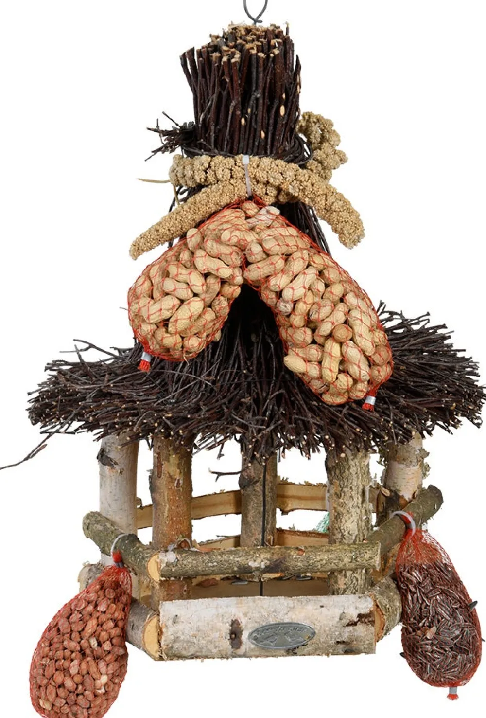 | Material laut Hersteller | Birkenholz, Grobspanplatte, PE, Stahl, Erdnüsse, Meisenknödel (Rindertalg, Weizen, Mais, Sorghum, gestreifte Sonnenblumenkerne, Calciumcarbonat), Hirse |