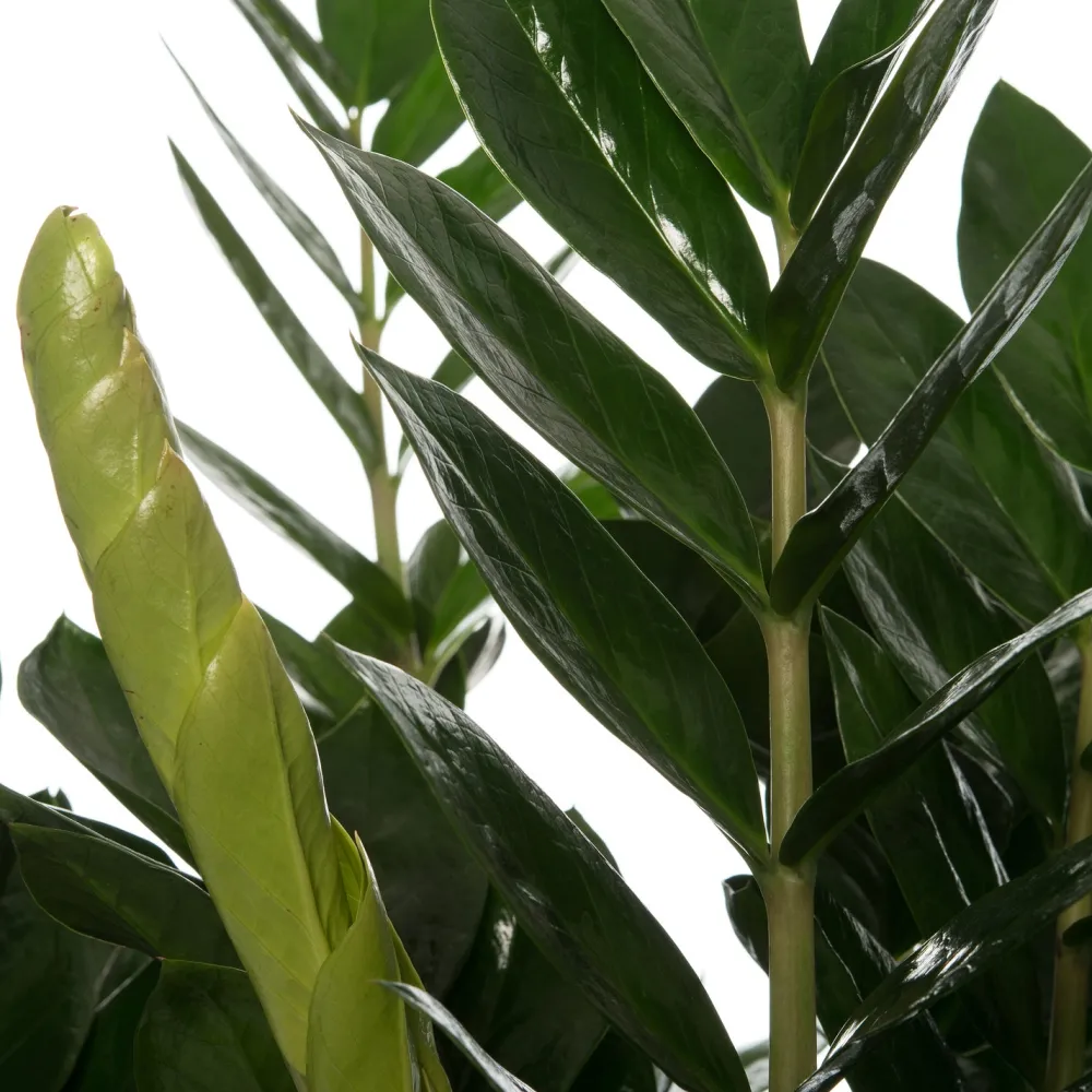Hierzulande wird die Zamiocula erst seit 1996 als Zimmerpflanze gezüchtet. Mit ihren elliptischen, dunkelgrün glänzenden Blättern ist sie eine Bereicherung für jedes Interieur. Mach dir keine Sorgen, wenn du auf dem Stengel einen schwarzen Fleck entdeckst, denn das gehört zur Pflanze dazu. Die Glücksfeder hat starke, dicke Wurzeln, stelle also sicher, dass die Pflanze einen Topf mit genügend Platz zum Wachsen hat. Achten beim Umtopfen besonders darauf, die Pflanze nicht zu beschädigen, weil die Zamioculas giftig ist.