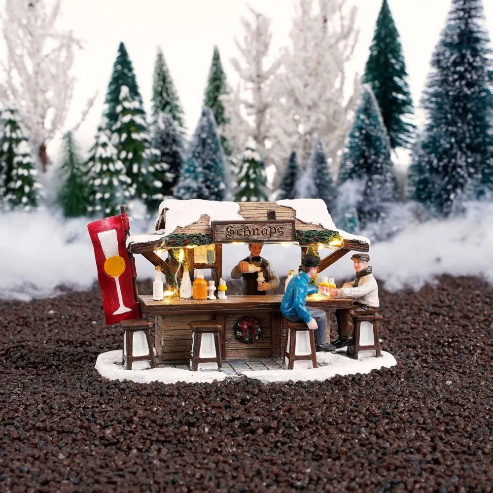 Vervollständige dein Weihnachtsdorf mit dieser gesellugen Miniatur, in der sich alles um den Genuss eines Schnäpschens dreht. An der Bar stoßen zwei Gäste an und der Barmann schenkt ein zusätzliches Getränk ein, ein großer Spaß! Der Stand ist mit warmweißen LED-Lichtern attraktiv beleuchtet. Das Licht funktioniert mit 2 AA-Batterien (exklusiv), aber die Miniatur verfügt auch über einen Adapteranschluss und kann optional mit einem 3-Volt-Adapter gekoppelt werden. Diese Miniatur ist aus der Schneewald-Kollektion von LuVille. Die Miniatur misst 16 x 7,5 x 9 cm.