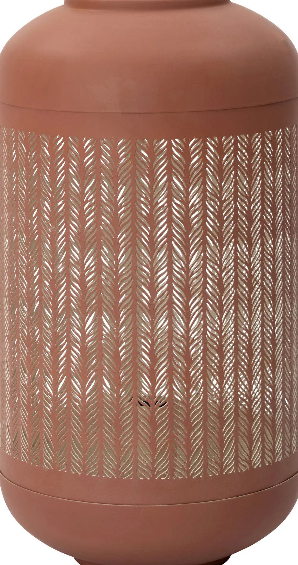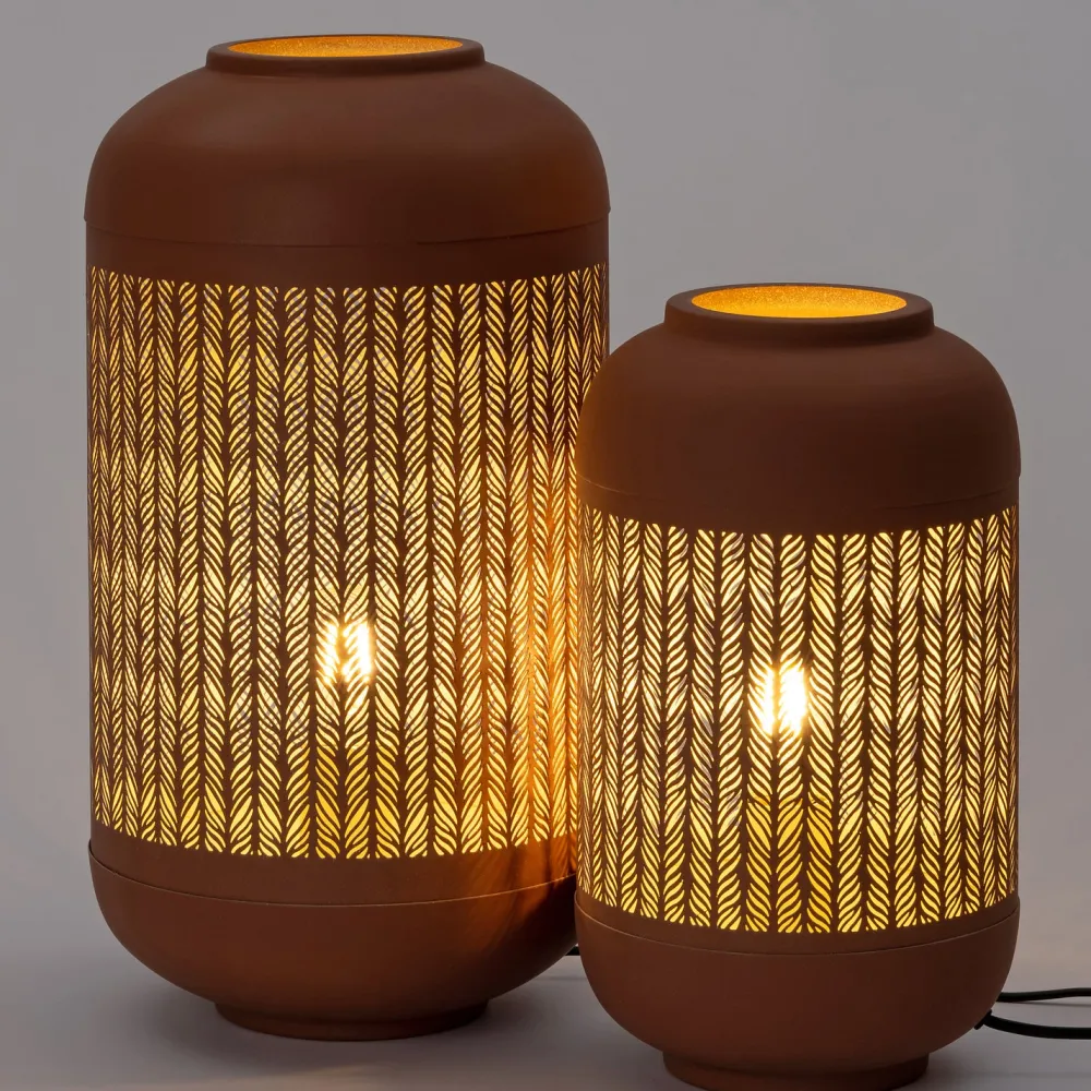 Diese schöne Lampe sorgt für Gemütlichkeit aus und lässt sich leicht an verschiedene Ortte stellen. Die Lampe ist aus Metall gefertigt, hat eine Zylinderform und eine braune Farbe. Der Durchmesser dieses Modells beträgt 24 cm bei einer Höhe von 44 cm.