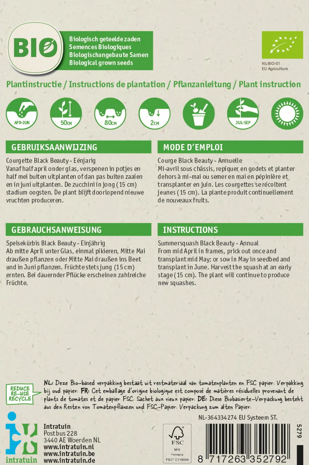 Zucchini ‚Black Beauty‘ bekommt dunkelgrüne Früchte mit einem tollen Geschmack. Du kannst sie Mitte April im Gewächshaus aussäen, in Töpfe vereinzeln und Mitte Mai nach draußen verpflanzen. Du kannst sie auch Mitte Mai im Freien in gut gedüngte Erde säen und im Juni an einem geschützten Ort auspflanzen. Die Früchte werden am besten in einem jungen Stadium geerntet, wenn sie 15-20 cm lang sind. Die Pflanze produziert dann noch eine ganze Zeit lang neue Früchte. Die Pflanzen mögen einen warmen, sonnigen Platz. Der Anbau unter Glas kann von Mitte Mai bis September geerntet werden, der Anbau im Freien von Juli bis Oktober.