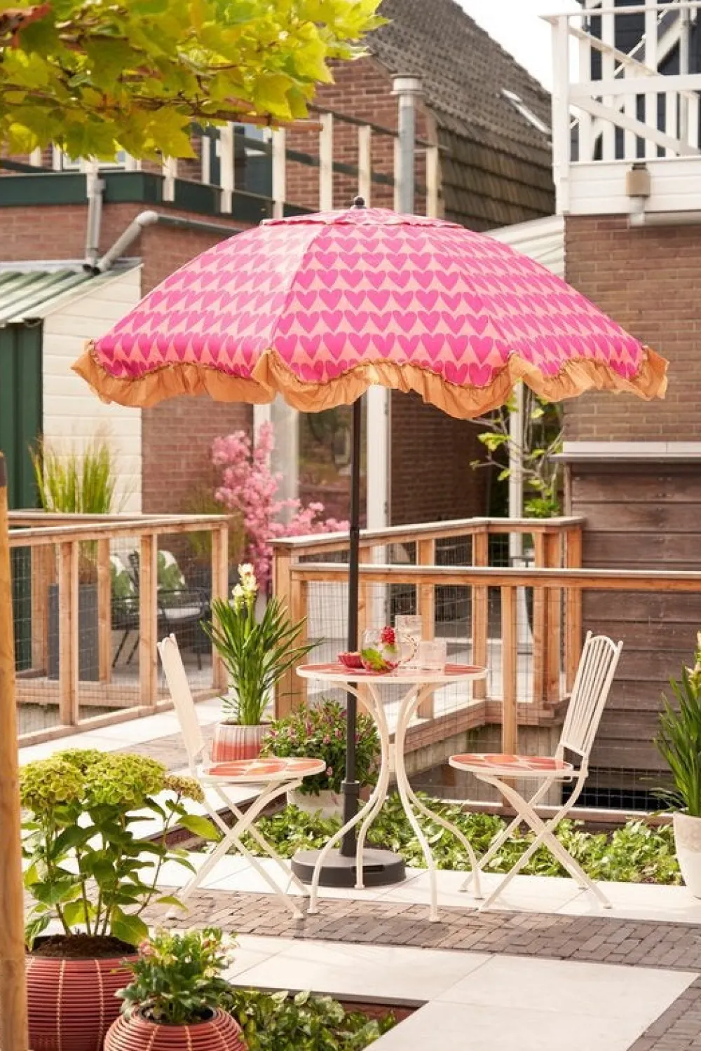 Mit dem rosafarbenen Sonnenschirm von Mica Decorations bringst du einen Hauch von Fröhlichkeit in jeden Sommertag. Das auffällige Design mit Herzdruck und verspielten braunen Rüschen macht diesen Sonnenschirm zu einem echten Hingucker im Garten oder am Strand.