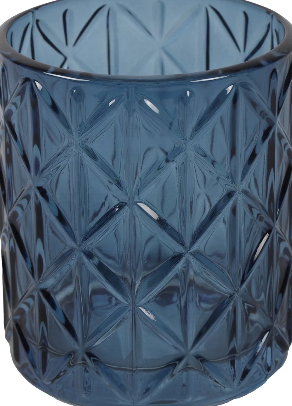 Wenn du mehrere Kerzenhalter aus der gleichen Serie zusammen aufstellst, entsteht beim Abbrennen der Kerzen ein farbenfrohes und verträumtes Gesamtbild. Dieses blaue Modell hat einen Durchmesser von 10 cm und eine Höhe von 12,5 cm.