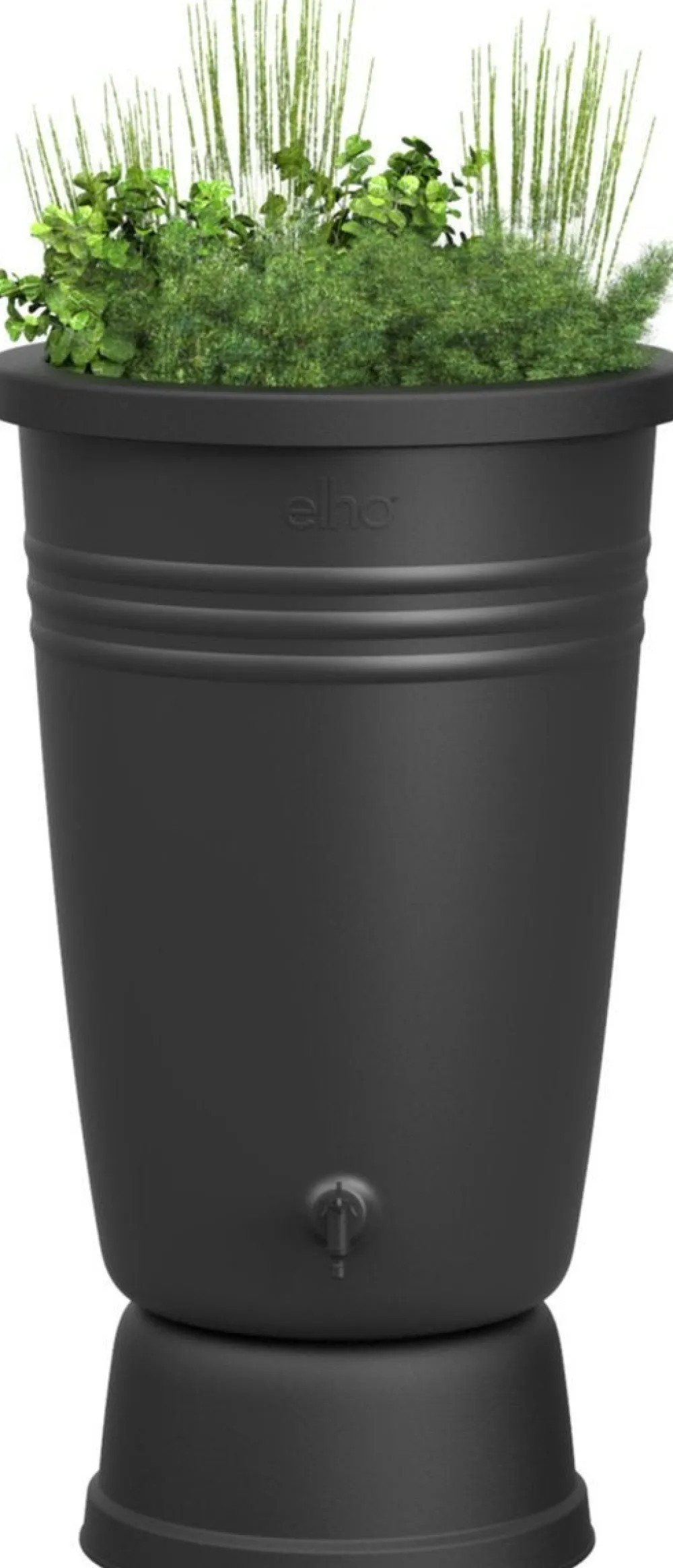 Gehst du sorgsam mit Wasser um? Die neue green basics Regentonne plus macht das Sammeln von Regenwasser zum Wiederverwenden einfach. Der Regentonne hat ein Fassungsvermögen von 200 Litern. Die elho Regentonne wird mit einem Hahn und einen stabilen Ständer geliefert. Auf der Tonne befindet sich sogar ein Pflanzbehälter, um sie mit etwas Grün zu verschönern. Aus 100 % recyceltem Material und mit Windenergie hergestellt. Die Regentonne aus Kunststoff ist ebenfalls zu 100 % recycelbar.