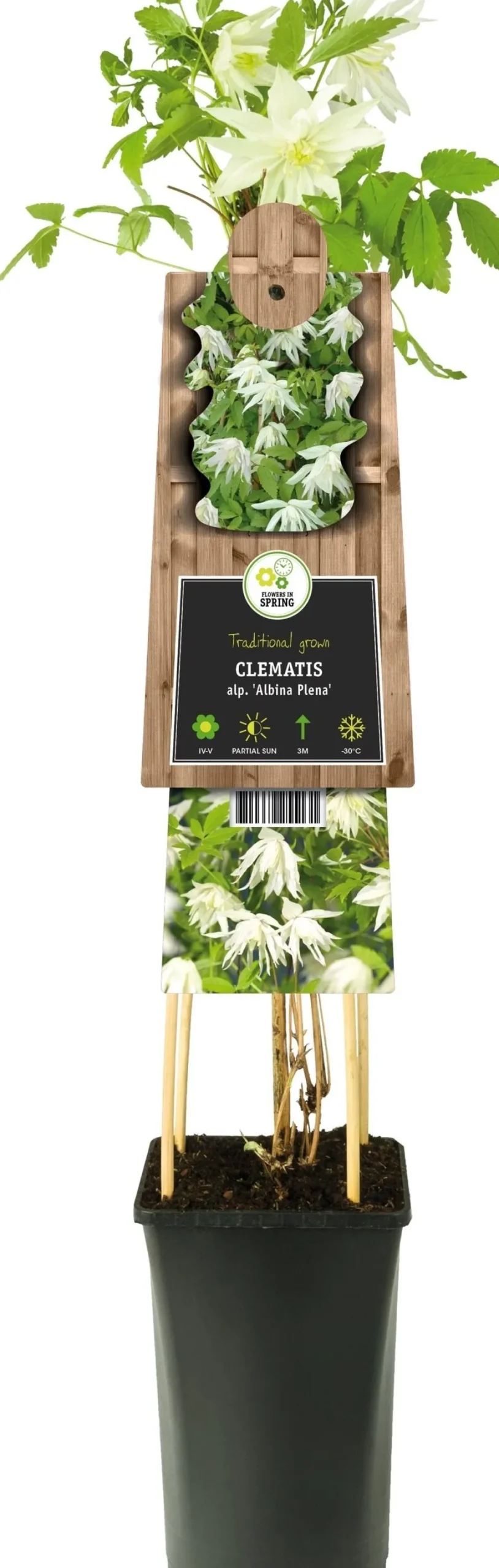 | Botanischer Pflanzenname | Clematis alpina ‚Albina Plena‘ |