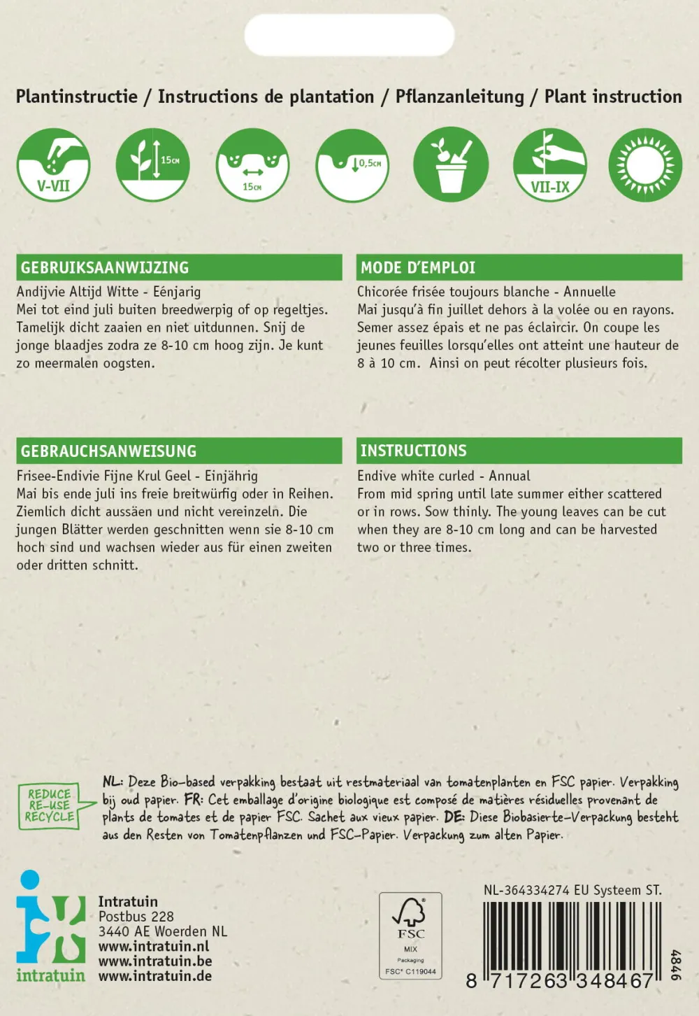 Bei der Sorte ‚Altijd Witte‘ handelt es sich um eine Frisee-Endivie, die keinen Kopf formt sondern mit losen Blättern wächst. Die Aussaat der Endiviensamen erfolgt ab Mitte Mai bis Ende Juli im Gemüsebeet, breitwürfig oder in Reihen. Du kannst die Endivien ruhig recht dicht säen, ein Ausdünnen ist nicht erforderlich. Wenn du die Endivienblätter bei einer Größe von 8-10 cm abschneidest und die Pflanzen weiter wachsen lässt, kannst du mehrere Male ernten. Die zarten, krausen Blätter dieser Friesee-Endivie können roh oder gekocht verzehrt werden.