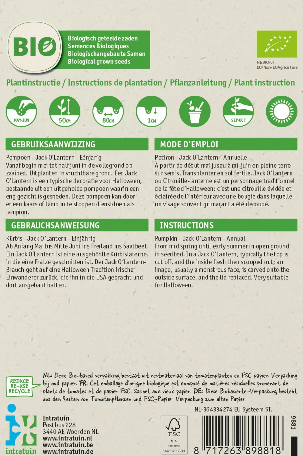 Die Zierkürbisse ‚Jack O’Lantern‘ werden häufig zum Schnitzen für Halloween verwendet. Sie sind während des Wachstums grün und färben sich erst bei Frost orange, wenn die Blätter und Stängel getrocknet sind. Dann können sie geerntet und an einem kühlen Ort für 4 Monate gelagert werden. Du kannst die Kürbisse auch ernten, solange sie noch grün sind, und sie im Haus auf einer sonnigen Fensterbank Farbe annehmen lassen.