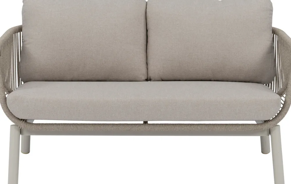 Das Lola-Loungesofa misst 77 x 143 x 69 cm und wird mit stabilen beigen Kissen für noch mehr Lounge-Vergnügen geliefert. Sitzhöhe 32 cm, 2 Jahre Garantie.