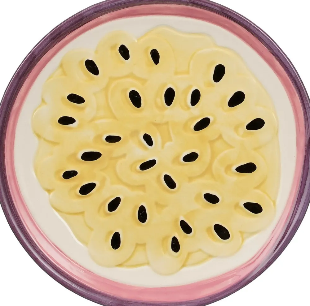 Bereichere deinen gedeckten Tisch mit dem Exotica Frühstücksteller von Mica Decorations, einer exotischen Ergänzung deines Geschirrsets! Der Steingutteller hat die Form einer Passionsfrucht und ist in einem tiefen Lila gehalten. Er ist handgefertigt und sowohl für die Spülmaschine als auch für die Mikrowelle geeignet. Er lässt sich auch sehr gut mit anderem Geschirr von Mica Decorations kombinieren! Der Durchmesser des Frühstückstellers ist 20,5 cm bei einer Höhe von 2 cm.
