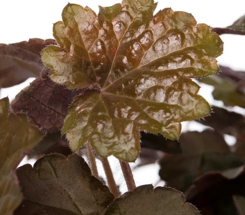 Das Purpurglöckchen „Palace Purple“ hat dunkelviolette, glänzende Blätter und kleine Blüten an dünnen Stielen. Diese Blattpflanze ist auch im Winter ein Blickfang. Schön zu kombinieren mit Pflanzen, die eine kontrastierende Farbe haben. Die Pflanze mag einen feuchten, humusreichen Gartenboden und einen Platz im Halbschatten. Nach dem Winter ist die Pflanze oft weniger schön.
