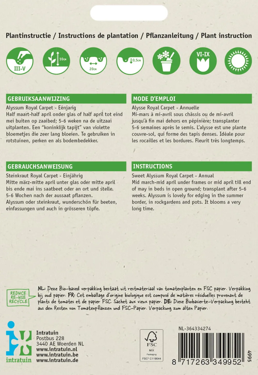 Alyssum ‚Royal Carpet purple‘ bekommt eine große Anzahl von kleinen, violetten Blüten, was für ein schöner Anblick! Aussaat von Mitte März bis Mai im Haus oder unter Glas bei Zimmertemperatur. Im Mai-Juni kannst du im Freien säen. Bedecke das feine Saatgut nicht, sondern drücke es nur gut an, denn für die Keimung wird Licht benötigt. Nach 2 Monaten blühen die Pflanzen oft. Wenn sie ihre Blütezeit beendet haben, kann ein Rückschnitt eine zweite Blüte hervorbringen. Alyssum wird nur 10 cm hoch und ist für Rabatten, Steingärten und Pflanzgefäße geeignet. Für eine gute Blüte wird ein sonniger Platz benötigt.
