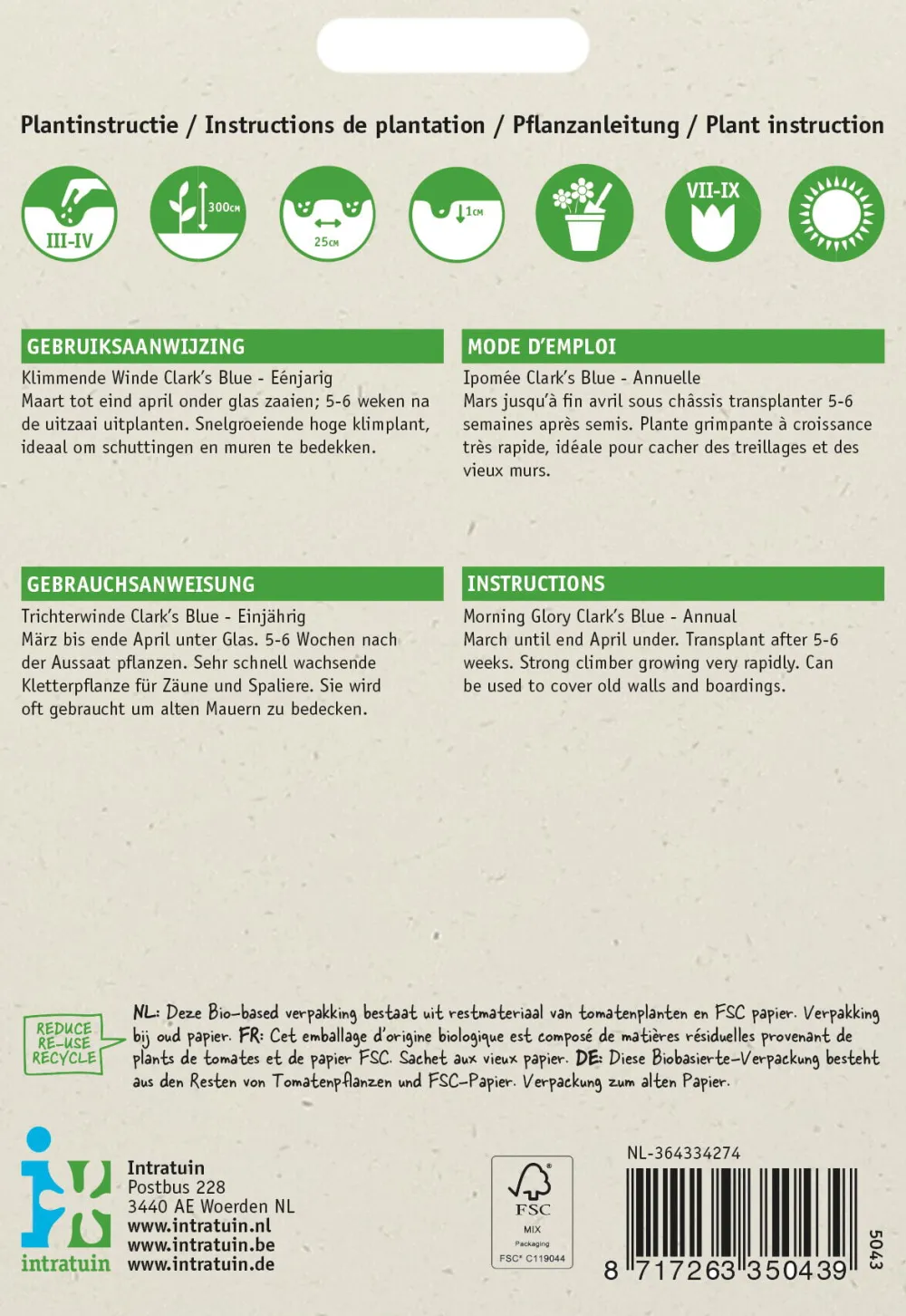 Die Trichterwinde wird in England ‚Morning Glory‘ genannt. Das bezieht sich auf ihre schönen Blüten, die nur morgens in ihrer vollen Pracht blühen. Jede Blume blüht nur einen Morgen, aber da es so viele von ihnen gibt, spielt das keine Rolle. Die Sorte ‚Clark’s Blue‘ bekommt himmelblaue, trompetenförmige Blüten und kann meterhoch klettern. Dazu braucht die Pflanze eine Stütze, um die sich die Ranken winden können, z.B. einen Wigwam aus Stöcken. Die Blätter dieser einjährigen Kletterpflanze sind herzförmig.
