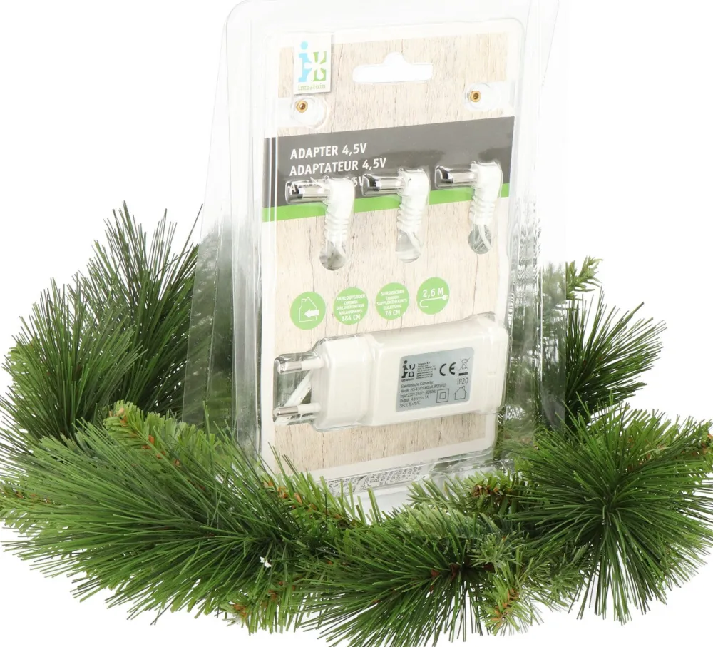 Willst du beleuchtete Weihnachtshäuser oder Weihnachtsdorf-Miniaturen mit beweglichen Elementen mit Strom versorgen ohne ständig Batterien auszutauschen oder Akkus aufzuladen? Mit dem Adapter von Intratuin ist dies möglich. Der Adapter arbeitet mit 4,5 Volt und hat eine 2,6 m lange Zuleitung.