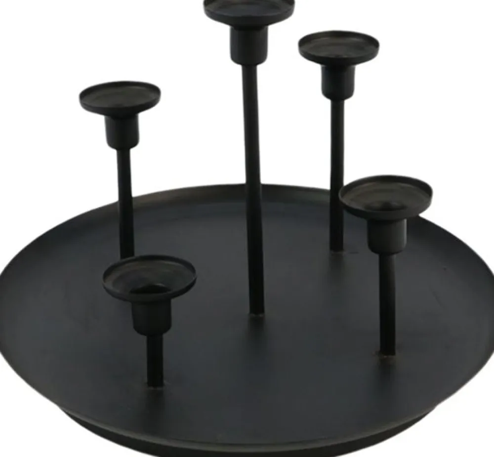 Dieser Kerzenständer ist ein wahres Schmuckstück. Das schwarze Gestell ist schlicht und elegant, wodurch das Licht der 4 Kerzen besonders schön zum Ausdruck kommt. Der Teller hat einen Durchmesser von 33 cm und der Kerzenständer hat eine Gesamthöhe von 23 cm. Der Kerzenständer passt zu vielen Einrichtungsstilen und lässt sich wunderbar dekorieren und kombinieren. Perfekt für einen Beistelltisch oder die Fensterbank! Gib ihm einen schönen Platz und bringe ihn zum Scheinen!