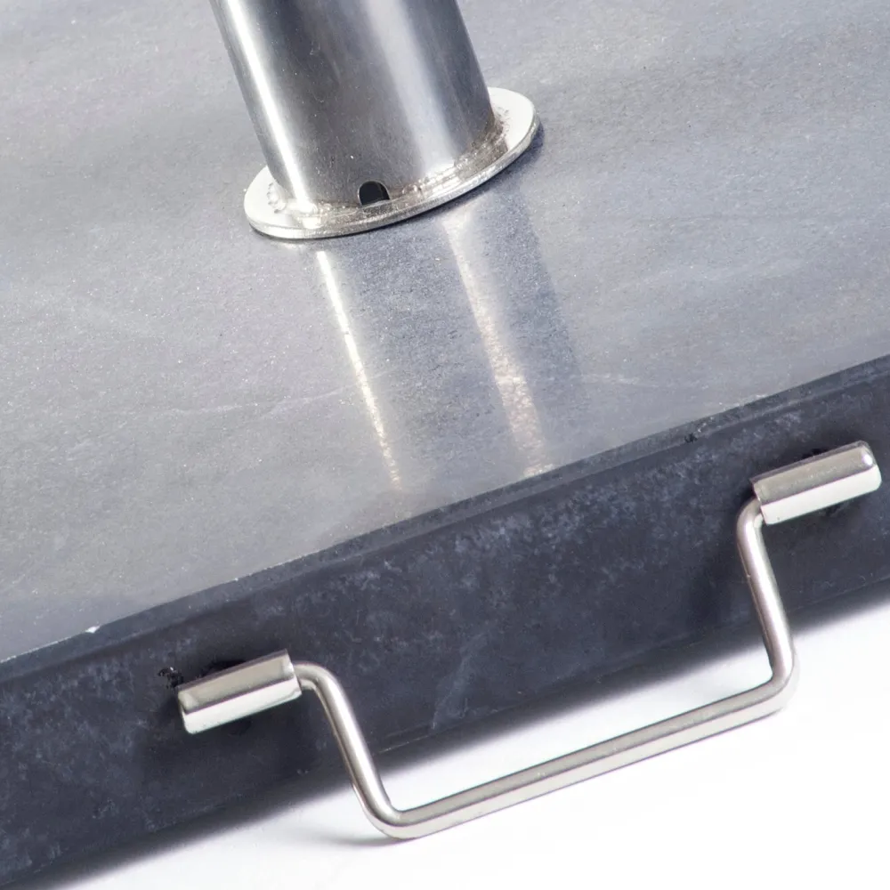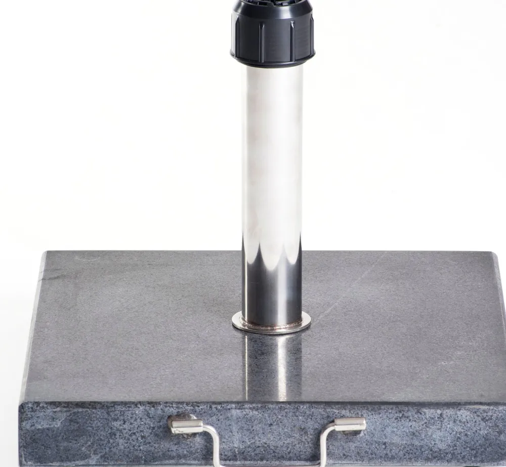 Dieser Sonnenschirmständer mit Rollen in der Farbe Schwarz hat ein elegantes Aussehen und ist aus poliertem Granit gefertigt, der für ein luxuriöses Aussehen und gute Stabilität sorgt. Der Sonnenschirmständer ist dank seines Griffs und der praktischen Räder an der Unterseite praktisch im Gebrauch und lässt sich trotz seines Gewichtes leicht bewegen. Regen, Wind, Sonne – diese Schirmständer trotzt allen Widrigkeiten!