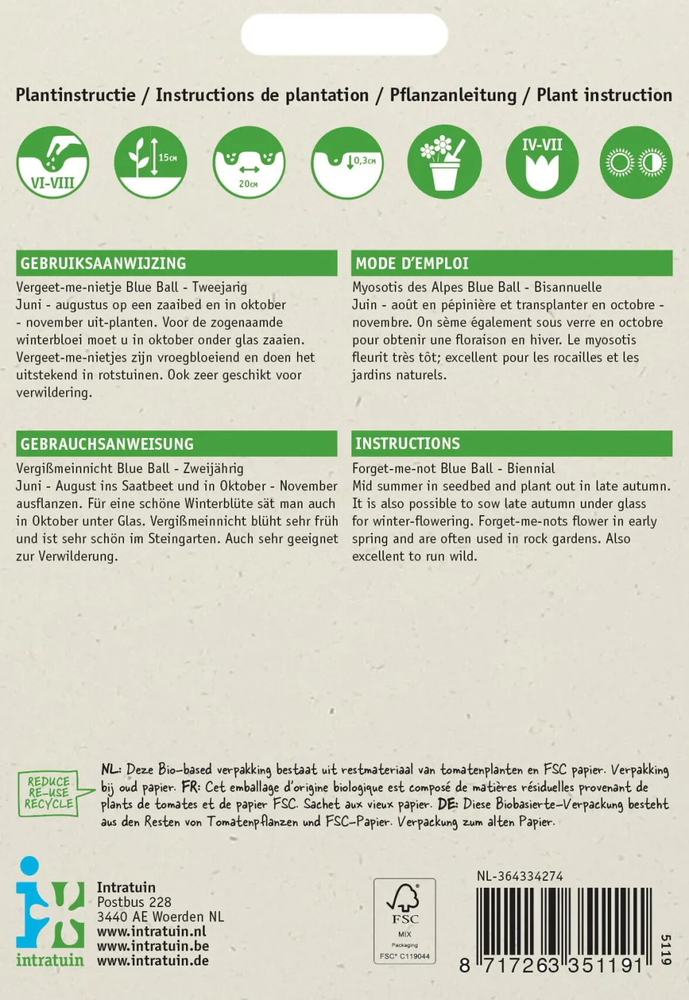 Vergissmeinnicht ‚Blue Ball‘ kann von Juni-September im Freien in ein Saatbeet gesät und im Oktober-November ausgepflanzt werden. Die Pflanzen halten der Winterkälte stand und blühen vom zeitigen Frühjahr bis in den August hinein weiter. Die Höhe beträgt 25-40 cm.