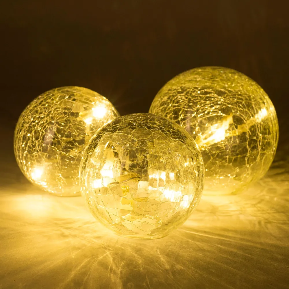 Mit dieser schönen Weihnachtsleuchte sorgst du im Handumdrehen für Gemütlichkeit in deinen eigenen vier Wänden. Das Licht schimmert besonders schön durch die Craquelé-Kugeln hindurch. Zwei der Kugelleuchten haben einen Durchmesser von 8 cm und die dritte Leuchte hat einen Durchmesser von 10 cm.