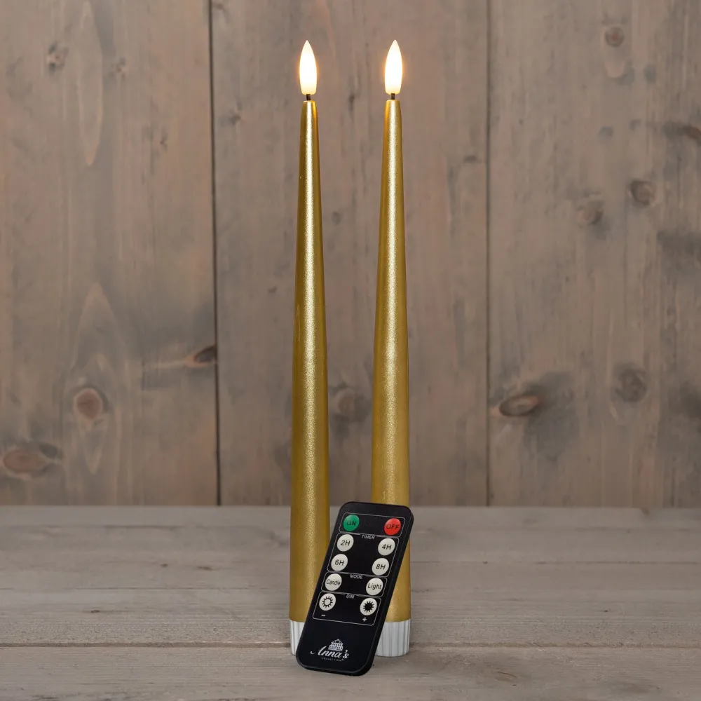 Die Anna’s Collection LED Stabkerzen Gold sind stimmungsvolle Kerzen, die den warmen Schein echter Kerzen mit der Sicherheit der LED-Technologie verbinden. Diese goldenen batteriebetriebenen Dinnerkerzen bestehen aus hochwertigem Kunststoff und haben eine realistische 3D-Flamme, die kaum von einer echten Kerze zu unterscheiden ist. Perfekt für ein gemütliches Weihnachtsessen oder einen romantischen Abend ohne Brandgefahr.