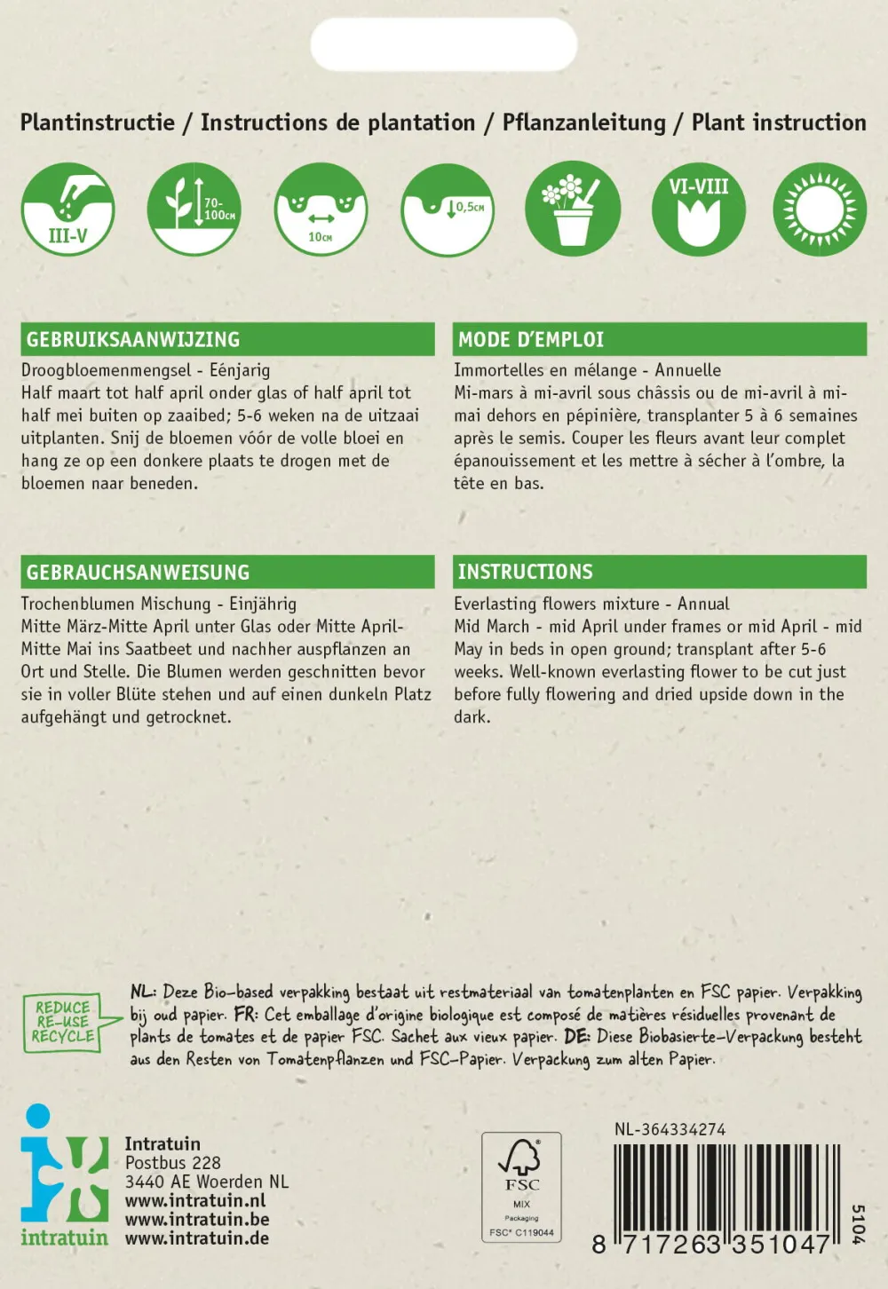 Diese Samenmischung enthält Samen verschiedener Blumen, die getrocknet werden können und sich für die Zusammenstellung eines Trockenstraußes eignen. Es handelt sich um bekannte, meist einjährige Pflanzen, die üppig blühen, wie Jungfer im Grünen, Echte Kamille, Salbei und Schafgarbe. Die Blumen eignen sich auch, um sie frisch zu pflücken und in eine Vase zu stellen. Um sie zu trocknen, schneidest du die Blüten mit einem langen Stiel ab und bündelst sie zu kleinen Sträußen. Hänge diese Bündel in einem trockenen und gut belüfteten Raum auf. Schneide sie ab, wenn sie am schönsten sind und am besten an einem bewölkten, aber trockenen Tag.