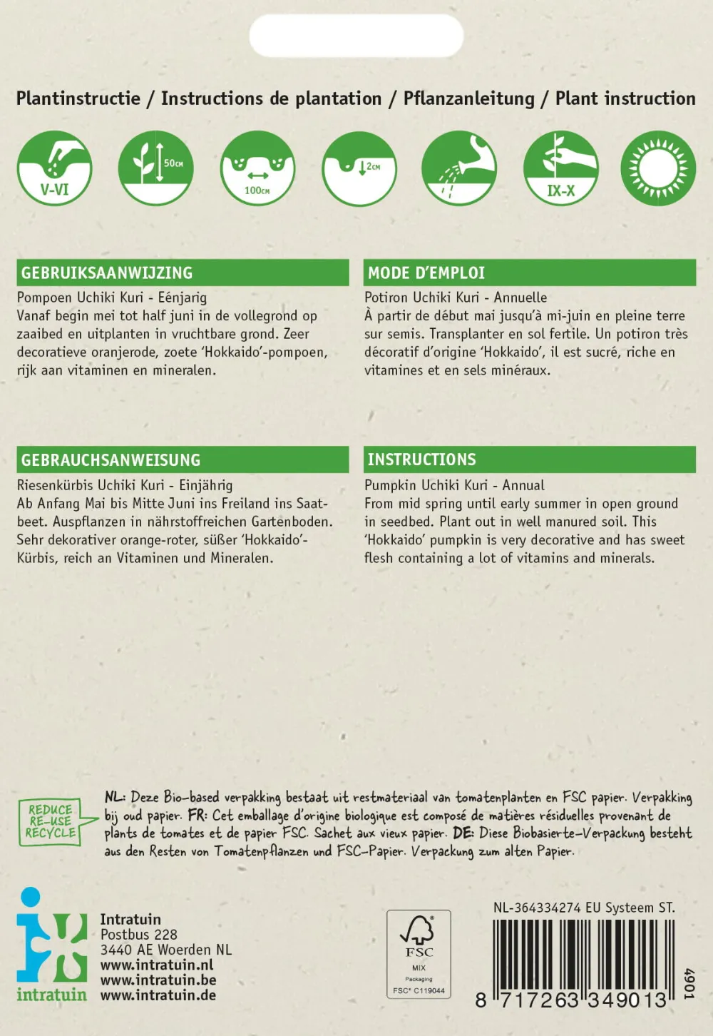 Cucurbita maxima ‚Oranje Zon‘ ist auch als ‚Uchiki Kuri‘ bekannt und gehört zum Hakkaido-Typ. Diese Sorte produziert orangefarbene Früchte, die bis zu 1,5 kg wiegen können. Das Fruchtfleisch ist süß und eignet sich sehr gut für Suppen. Kürbisse lieben Wärme und vertragen keinen Nachtfrost. Daher sollten die Pflanzen an einem sonnigen Standort angebaut und erst ab Mitte Mai draußen in die Erde gepflanzt werden. Der Boden muss vor dem Pflanzen gut mit Kompost oder Kuhdungpellets gedüngt werden. Außerdem sollten die Pflanzen regelmäßig gegossen werden. Lege die Früchte auf Stroh oder einen Stein, um sie sauber zu halten.