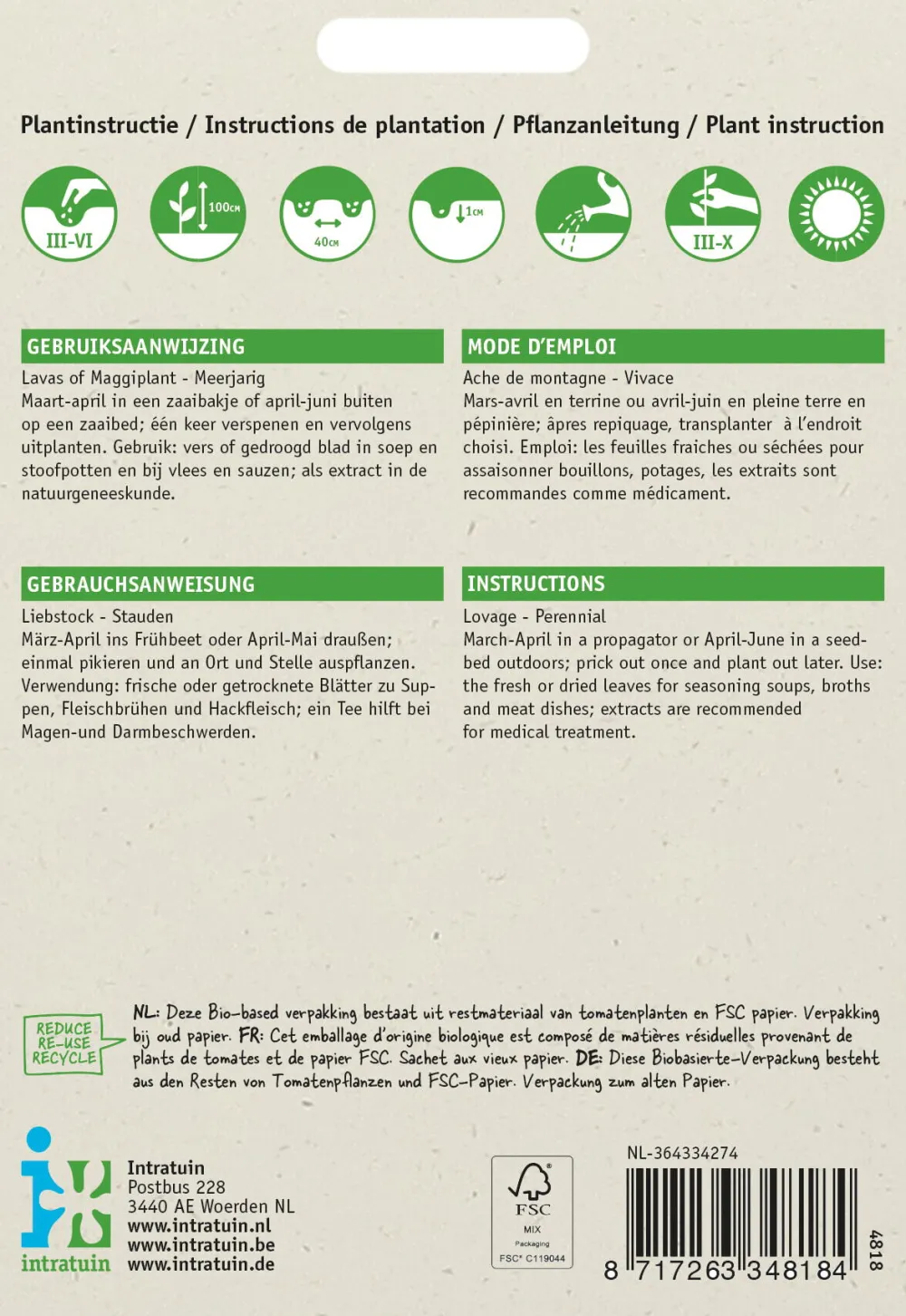 Liebstöckel hat einen aromatischen Duft und kann in einer Vielzahl von Gerichten verwendet werden, wird aber vor allem in Suppen eingesetzt. Durch die Zugabe von Liebstöckel wird weniger Salz benötigt. Säe von April bis Juli in einem Topf oder Saatbeet bei 20 Grad Celsius in feuchter Erde. Nach maximal 3 Wochen ist das Saatgut gekeimt. Wenn die Pflanzen groß genug zum Auspflanzen sind, können sie in den Garten gesetzt werden. Die Pflanzen können etwa 2 Meter hoch werden, also gib ihnen viel Platz, zum Beispiel im hinteren Teil des Kräutergartens mit einem Abstand von 40 x 40 cm. Sie ist eine mehrjährige Pflanze, die im Winter oberirdisch abstirbt und im Frühjahr mit frischen grünen Blättern wieder austreibt.