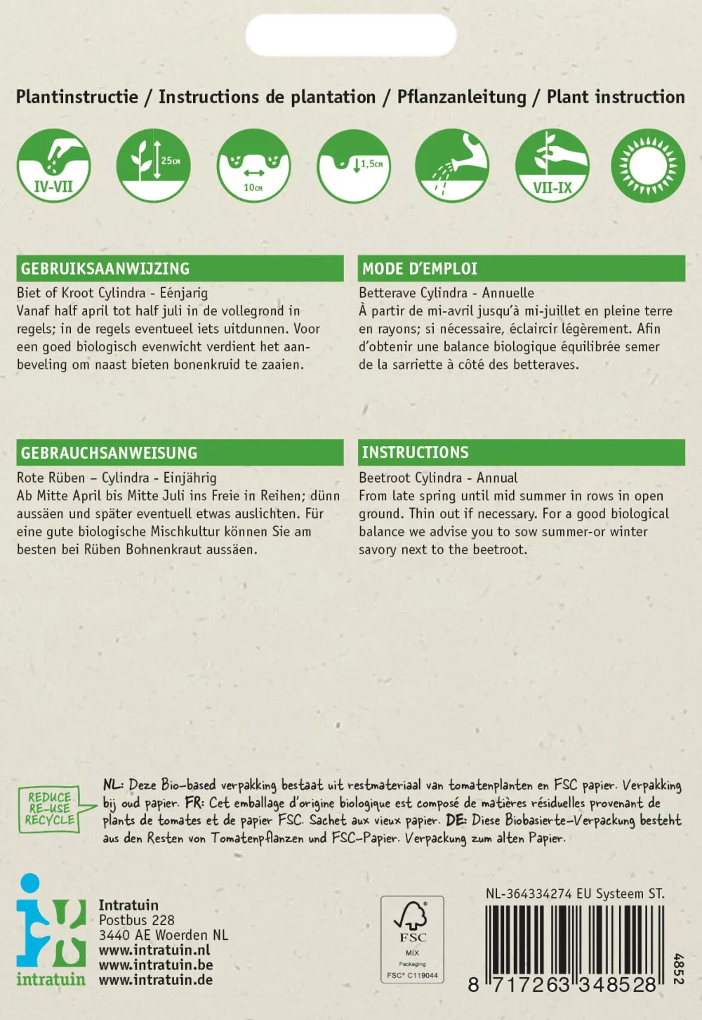 Diese rote Bete hat einen süßen und saftigen Geschmack. Diese Sorte ist für den frühen Anbau geeignet und hat im Unterschied zu anderen Sorten keine runde Form sondern die längliche eines Zylinders. Rüben können nicht verpflanzt werden, also säe sie direkt im Garten aus. Der Anbau im Gewächshaus ist ebenfalls möglich, in diesem Fall solltest du im Februar/März säen. Wähle einen Platz in der Sonne oder im Halbschatten. Hast du schweren Lehm in deinem Garten oder ist der Boden ziemlich nass? Dann baue die Rüben in Hochbeeten an, die mit grobem Sand verbessert wurden. Die eigentliche Rübe ist eine Wurzelknolle, die unterirdisch wächst.