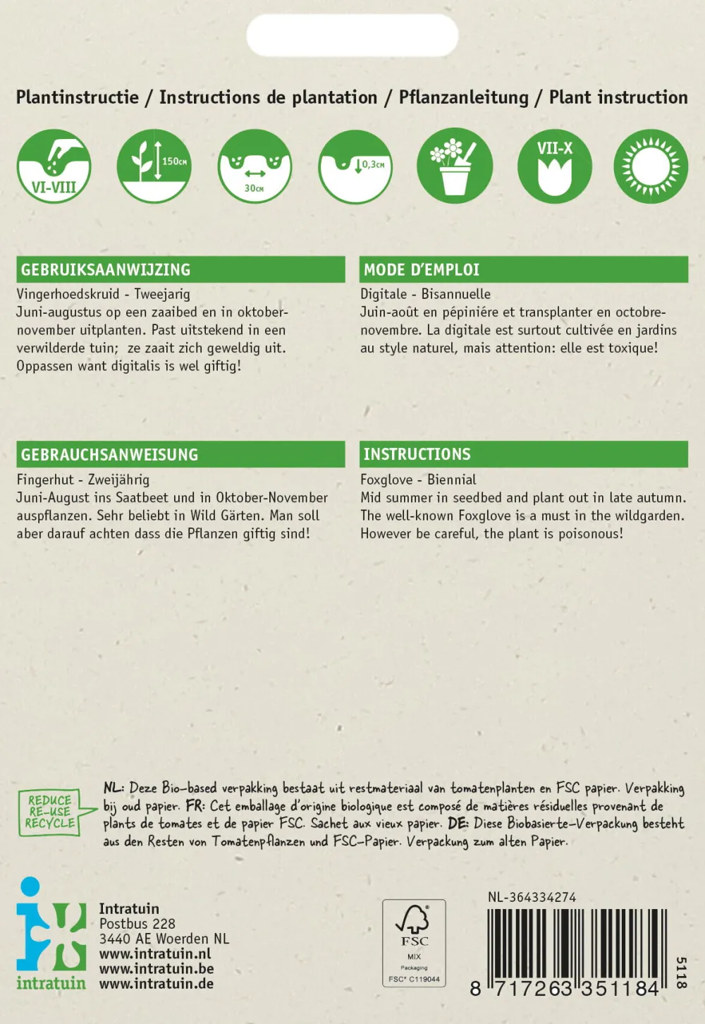 Der Fingerhut ist eine 2-jährige Pflanze, die im ersten Jahr eine Rosette aus großen, behaarten Blättern bildet und erst im zweiten Jahr blüht, woraufhin sie abstirbt.