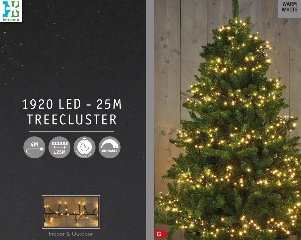 Diese Cluster-Lichterkette ist 25 m lang und mit 1920 LEDs ausgestattet, die ein warmweißes Licht abgeben. Die schöne Büschellichterkette ist für Außen geeignet und lässt sich als Weihnachtsbaumbeleuchtung für Bäume mit einer Höhe von 3 bis 3,5 m. In Kombination mit dem Intratuin Dimmer für LED-Clusterbeleuchtung (EAN 8713619391118) ist diese Cluster-Lichterkette für außen auch dimmbar.