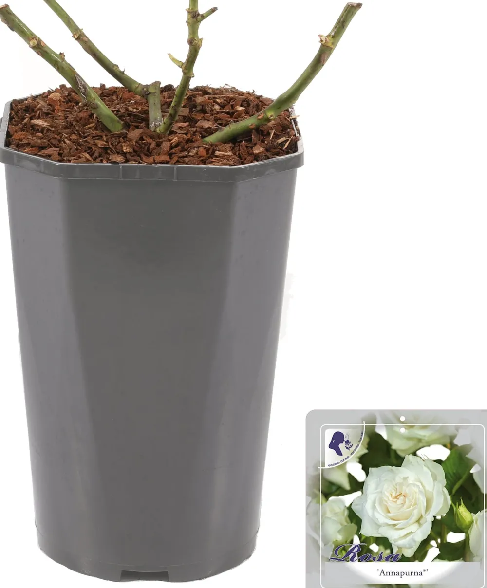 Rosen werden für unterschiedliche Zwecke gezüchtet, und hier liegt auch der größte Unterschied zwischen den Rosensorten. Rosen werden als Schnittblumen für die Vase oder als Rosenstrauch für den Garten als Strauchrose gezüchtet. Die Arten, die für den Anbau von Schnittblumen verwendet werden, haben lange aufrechte Stiele: praktisch für eine Vase. Die Strauchrosen hingegen sind gut durchwurzelt und haben eine längere Blütezeit. Bei dieser Sorte Rosa ‚Annapurna‘ handelt es sich um eine Strauchrose mit schönen, großen weißen Blüten.