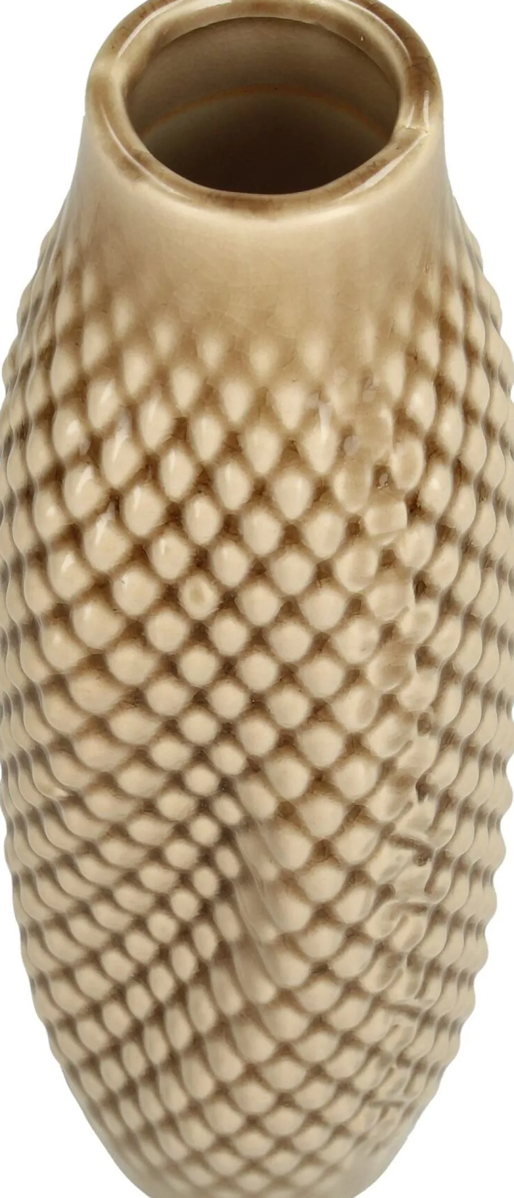 Diese Vase ist braun, wodurch sie eigentlich mit jedem Stil gemischt oder kombiniert werden kann. Die Oberfläche weist ein dreidimensionales Muster auf, das die Textur nicht nur sichtbar, sondern auch angenehmbar fühlbar macht. Das verleiht ihr eine schöne Tiefenwirkung. Außerdem hat sie ein schönes gleichmäßiges geometrisches Muster.
