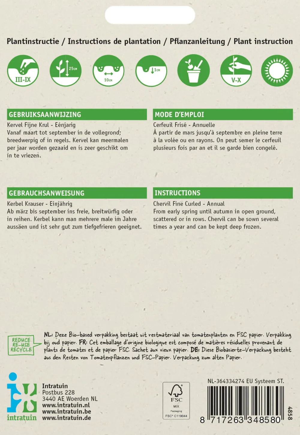 Dieser ‚Krause‘ Kerbel Anthriscus cerefolium ist ein einjähriges Kraut, der allerdings auch etwas Kälte verträgt. Die Kerbel-Samen kannst du ab April direkt draußen in dein Kräuterbeet säen. Wenn du kontinuierlich eine kleine Menge der Kerbelsamen ausbringst, kannst du von Juni bis Oktober ernten. Der Kerbel kann sowohl frisch als auch getrocknet verarbeitet werden und lässt sich auch gut einfrieren. Der ‚Krause‘ Kerbel hat einen milderen Geschmack als der ‚Echte‘ Kerbel.