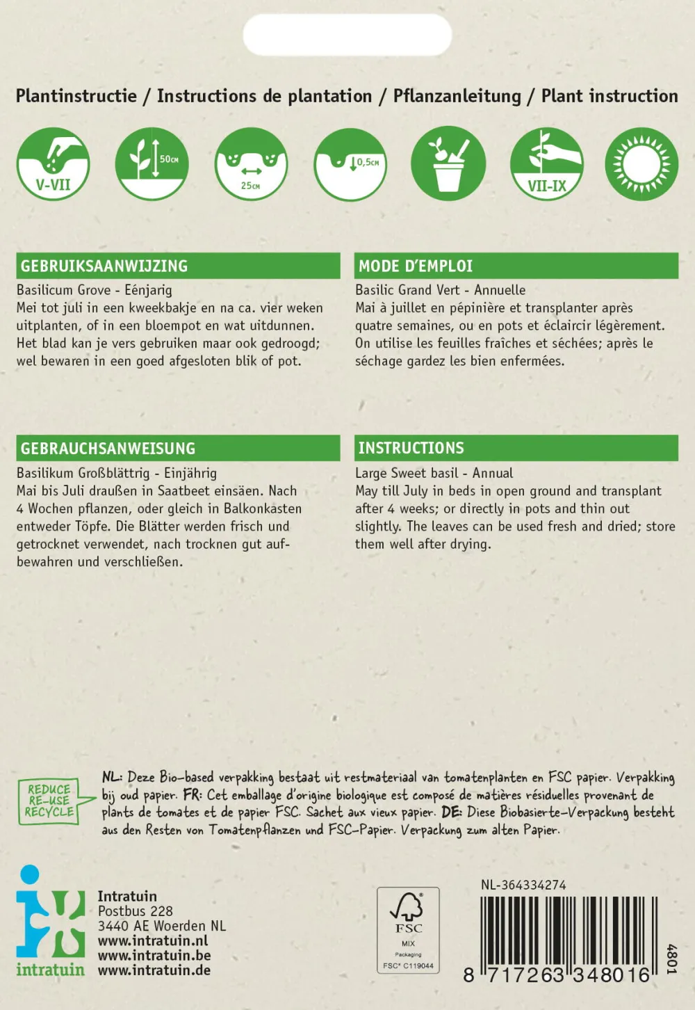 Der großblättrige Basilikum kann ab Anfang April im Haus in ein Saatbeet oder in Töpfe gesät werden. Die Samen keimen in der Regel innerhalb einer Woche, bei einer Temperatur von 20-25 Grad Celsius. Nach Mitte Mai können die Pflanzen bei Bedarf ausgepflanzt werden, nachdem sie sich langsam an die niedrigeren Temperaturen gewöhnt haben. Von Mitte Mai bis Juli kannst du sie im Freien in einem Zimmergewächshaus aussäen und nach etwa vier Wochen umpflanzen oder in einem Blumentopf halten. Der Vorteil des Anbaus in einem Blumentopf oder Gewächshaus ist, dass du weniger von Schnecken belästigt wirst, die gerne die zarten Blätter fressen. Die duftenden Blätter können frisch oder getrocknet verwendet werden.