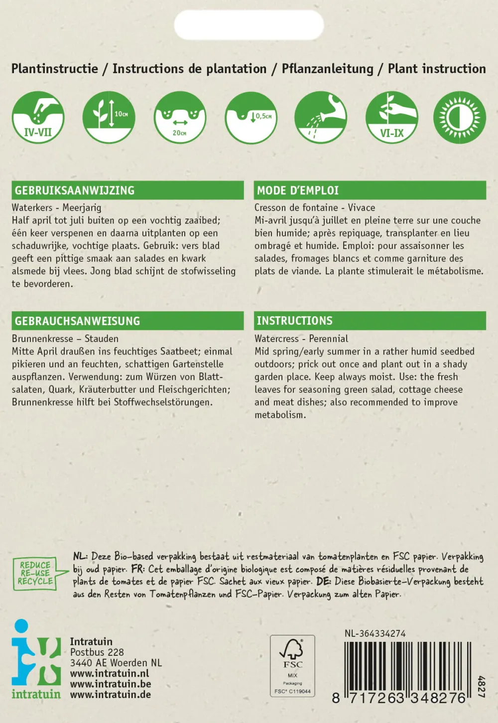 Brunnenkresse kann das ganze Jahr über im Haus in einer Saatschale an einem hellen Standort ausgesät werden. Da jeder Samen keimen wird, ist es ratsam, nur einen kleinen Teil des Tütchens gleichzeitig zu säen. Wenn du in einem Anzuchtkasten mit Deckel säest, achte dann auf ausreichende Belüftung, sodass Schimmel keine Chance hat. Wenn du nur den oberen Teil der Pflanze abschneidest, kann die Pflanze nachwachsen und du kannst über einen längeren Zeitraum Kresse ernten. Tipp: Säe nicht zu dicht nebeneinander, sodass die Kressepflanzen ausreichend Platz haben.
