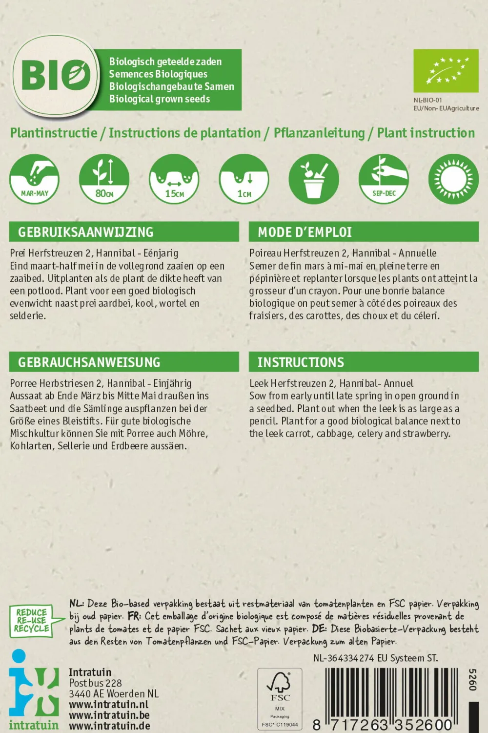 ie Porree-Sorte ‚Hannibal‘ wird ab Ende März bis Mitte Mai in ein Saatbeet gesät. Die Samen keimen bereits bei niedrigen Temperaturen, aber müssen dennoch abgedeckt werden, weil der Lauch ein sog. ‚Dunkelkeimer‘ ist. Die jungen Lauchpflanzen können ab April ausgepflanzt werden, wenn sie so dick sind wie ein Bleistieft. Pflanze den Lauch in einem Pflanzabstand von 40 x 15 cm so tief wie möglich ein. Beim Anbau ist es ratsam, die Pflanzen anzuhäufeln, damit der untere Teil des Lauchs weiß und zwart bleibt. Zwischen Mitte August und Mitte November kannst du den Lauch ernten. Die Sorte ‚Hannibal‘ bildet schwere Lauchstangen und kann über einen langen Zeitraum bis spät in den Herbst hinein geerntet werden. Bei strengem Frost muss der Lauch jedoch abgedeckt werden.
