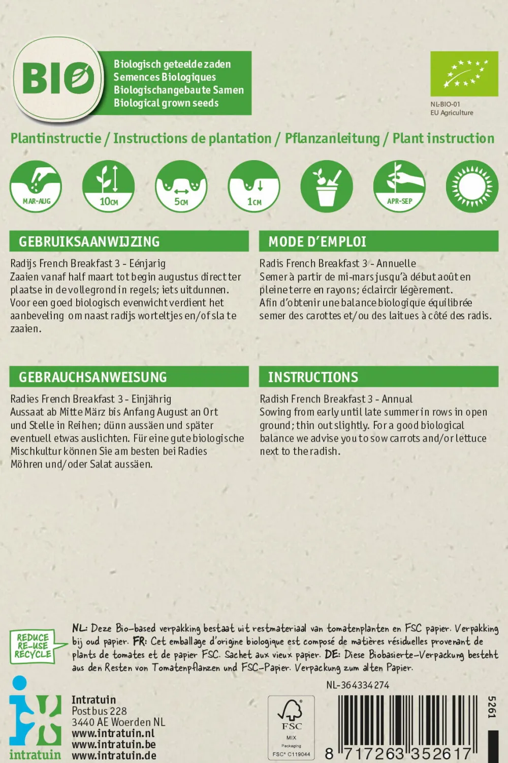 Wir kennen das Radieschen für seinen würzigen und frischen Geschmack, köstlich als Snack oder in einem Salat. Radieschen sehen rund aus, aber eigentlich ist es die verdickte Wurzel der Pflanze. Lass die Knolle nicht zu groß werden, sonst wird sie mehlig im Geschmack. Ein Radieschen enthält kein Fett, wenig Kalorien und viele Ballaststoffe – ein leckerer gesunder Snack. Die meisten Radieschen haben eine rote Farbe, aber es gibt auch gelbe, weiße oder rosa Sorten. Das Saatgut in dieser Tüte ergibt Radieschen der Sorte ‚French Breakfast‘ in der Farbe Rot und Weiß, sie haben eine schöne ovale Form und sind für den Anbau im Freien geeignet.