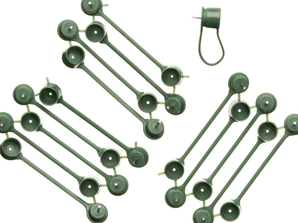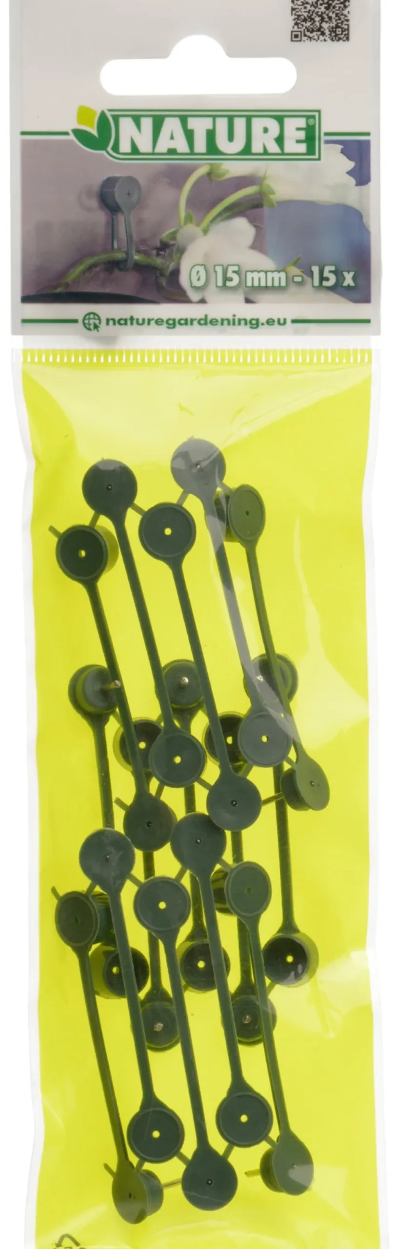 Pflanzenklammern aus grünem Polyethylen (PE) mit Schnappverbindung von Nature zum Stützen der Zweige von Kletterpflanzen. Das Set besteht aus 15 Pflanzenklammern und ist geeignet für einen Zweigdurchmesser von maximal 15 mm. Du piekst die Klammern, ähnlich einer Reißzwecke, in den Holzzaun oder einen anderen Untergrund, der dafür geeignet ist, führst den zu stützenden Zweig hindurch und lässt die Klammer zuschnappen. So hat deine Pflanze eine gute Stütze und kann sicher weiterranken.
