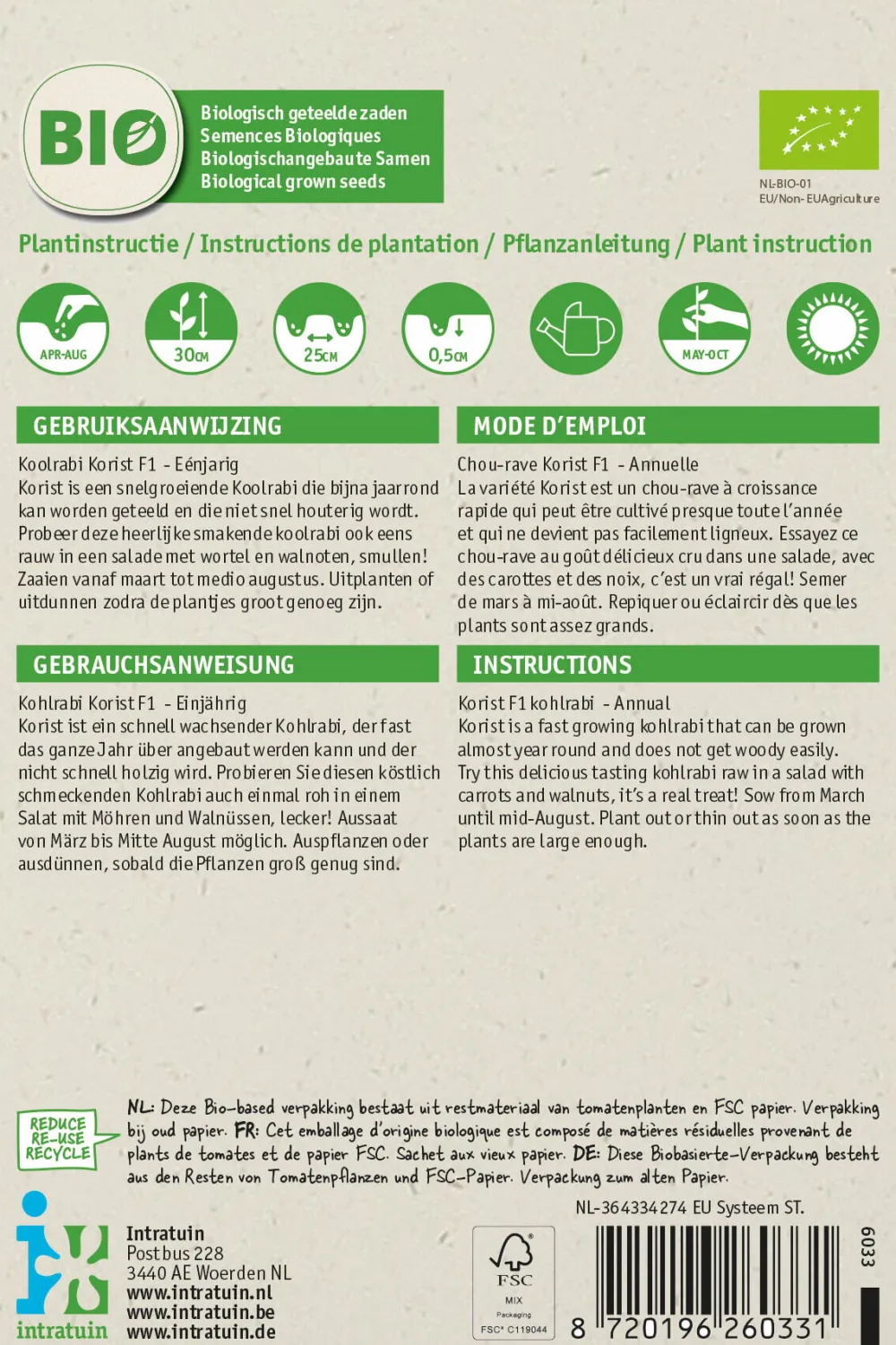 Brassica oleracea ‚Korist‘ ist eine Kohlrabi-Sorte, die oberirdisch recht große Knollen bildet. Sie kann sowohl unter Glas als auch im Freiland angebaut werden. Beim Anbau ist es wichtig, dass der Boden nicht zu stark gedüngt wird, damit das Wachstum gleichmäßig ist und der Boden ausreichend feucht bleibt. Bei Trockenheit verholzen die Knollen und sind dann nicht mehr lecker. Die Knollen können ab Mitte Februar im Gewächshaus ausgesät und etwa Mitte März in einem kalten Gewächshaus im Abstand von 30 x 25 cm ausgepflanzt werden. Geerntet werden kann dann ab Mitte Mai. Bei Anbau im Garten erfolgt die Ernte einige Wochen später. Die Knollen sind erntereif, wenn sie einen Durchmesser von mindestens 7 cm haben. Lass sie nicht zu weit wachsen, da sie sonst faserig werden.