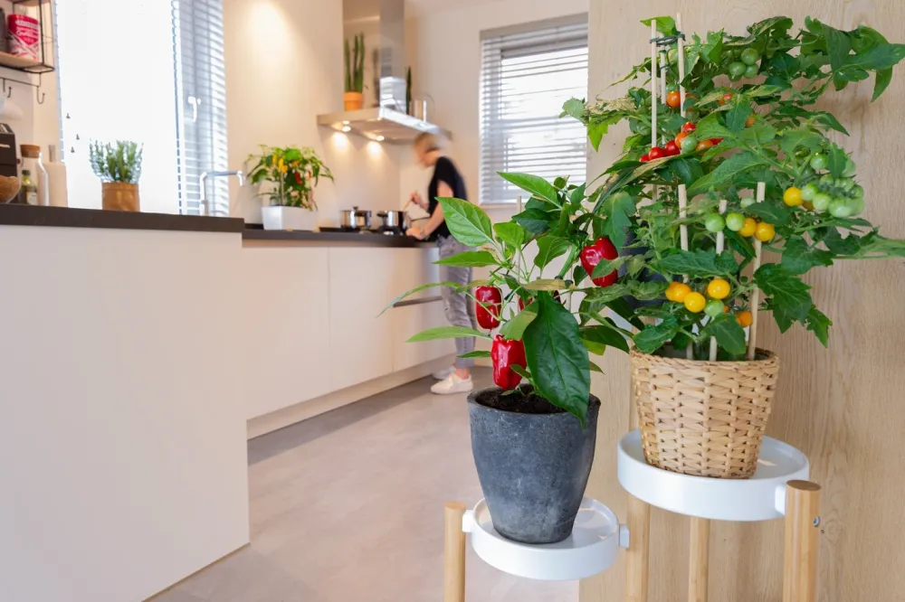 Die Capsicum annuum gibt es in vielen verschiedenen Sorten: von der Gemüsepaprika bis hin zur feurigen Chili. Diese Paprikapflanze bringt kleine, rote Früchte hervor, die sich als Mini-Paprika wunderbar zum Snacken eignen.Een echte plukpaprika.