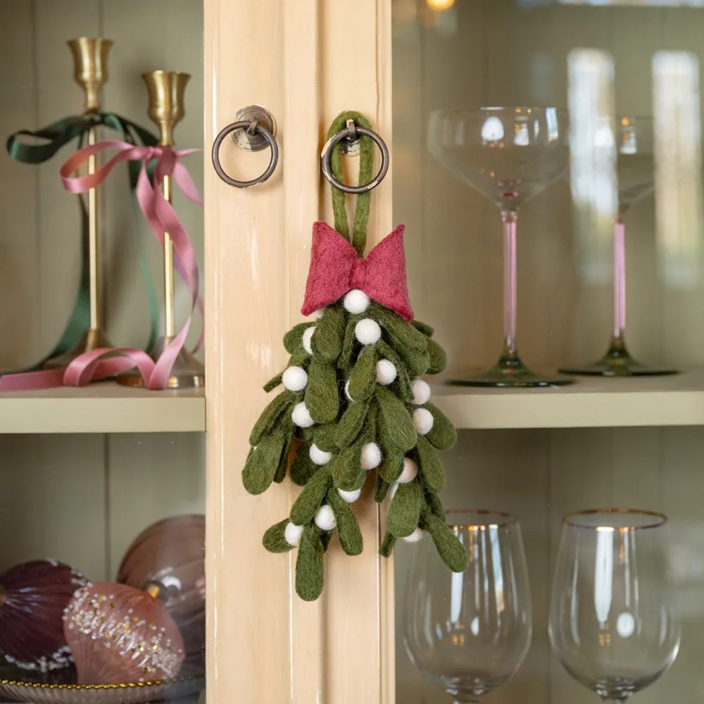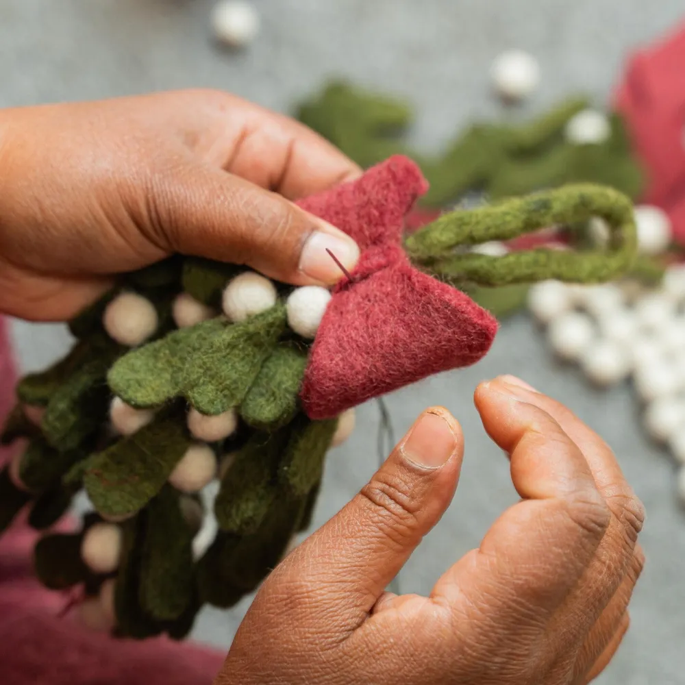 Dieser Mistelzweig-Anhänger ist viel mehr als nur eine Weihnachtsdeko – er ist ein dekoratives Highlight. Hänge ihn an einen gut sichtbaren Platz an deinem Weihnachtsbaum, damit die Symbolik von Liebe und Glück im Mittelpunkt steht. Mistelzweige sehen auch über einem Türrahmen wunderschön aus und erinnern an den alten Brauch, dass sich Liebende unter dem Mistelzweig küssen. Du kannst diesen Weihnachtsschmuck auch an einem dekorativen Zweig in einer Vase aufhängen, ihn mit anderen Ornamenten an einem Kranz kombinieren oder ihn als Blickfang auf dem Weihnachtstisch verwenden. Dank des weichen Filzmaterials fühlt sich der Schmuck warm und gemütlich an und passt perfekt zu einer natürlichen oder rustikalen Weihnachtsatmosphäre. Die handgefertigte Verarbeitung macht jedes Stück zu einem Unikat und verleiht deiner Weihnachtsdekoration eine ganz persönliche Note. Kombiniere den Mistelzweig mit anderen Ornamenten von Sjaal met Verhaal für eine harmonische und bedeutungsvolle Weihnachtskollektion. Was macht diesen Schmuck so besonders? Jedes Weihnachtsornament von Sjaal met Verhaal wird mit Sorgfalt und Liebe von Frauen in Nepal handgefertigt, die durch diese Initiative faire Löhne und Arbeitsbedingungen erhalten. Mit dem Kauf dieses Produkts unterstützt du nicht nur das Kunsthandwerk, sondern trägst auch zu einer besseren Zukunft für diese Frauen und ihre Familien bei. Die Marke Sjaal met Verhaal steht für faire Herstellung und fairen Handel, was bedeutet, dass jedes Ornament unter fairen Bedingungen produziert wird. Dadurch ist diese Weihnachtsdekoration nicht nur schön anzusehen, sondern auch ein wunderbares Geschenk – für dich selbst oder als bedeutungsvolles Weihnachtsgeschenk. Die Kombination aus traditioneller Symbolik, nachhaltiger Produktion und einzigartiger Handwerkskunst macht diesen Mistelzweig-Anhänger zu einer bewussten Wahl für die Feiertage. So gestaltest du die Feiertage zu etwas ganz Besonderem – mit einer Geschichte, die zählt.