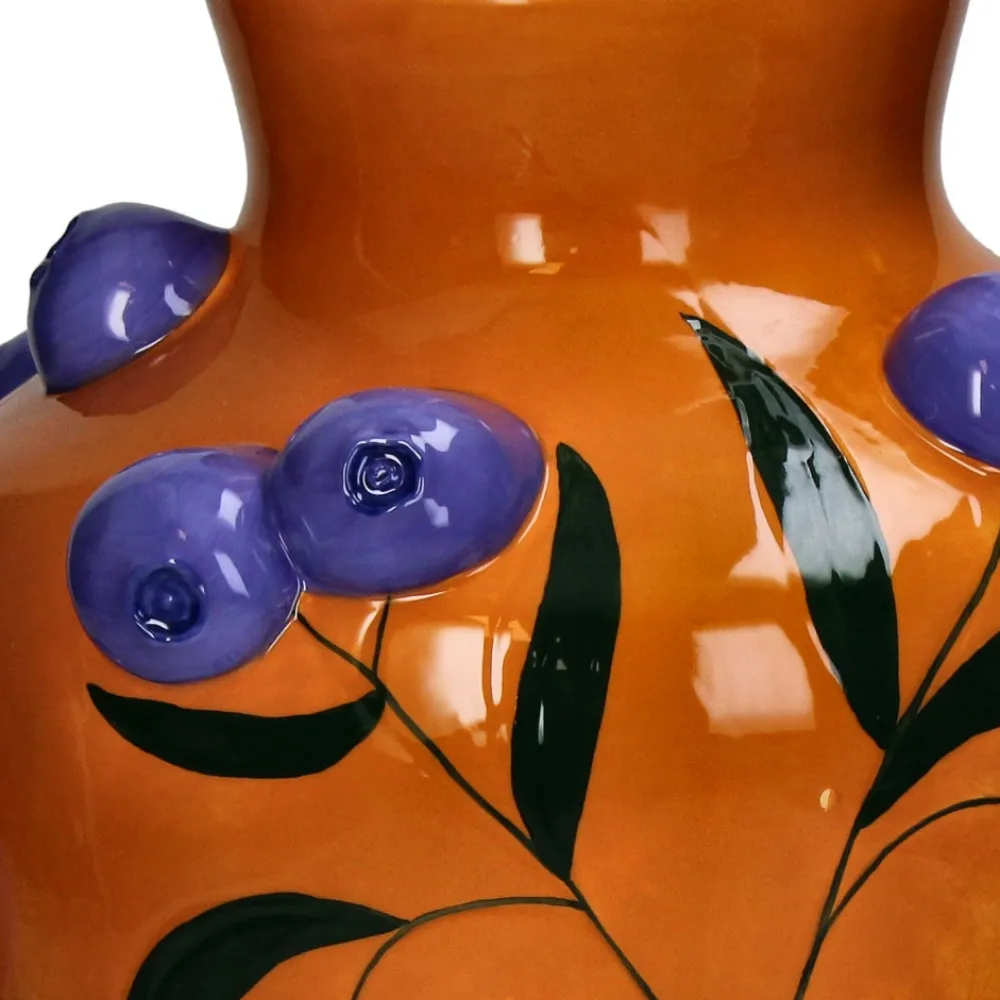 Verschönere dein Interieur mit dieser tollen Vase Fruity Fiesta. Die Vase ist aus Dolomit gefertigt und hat eine fröhliche orange Farbe mit blauen Akzenten. Ihr einzigartiges Heidelbeer-Design und die glänzende Oberfläche machen diese Vase sowohl mit als auch ohne Blumen zu einem echten Hingucker. Diese Vase ist in verschiedenen Varianten erhältlich, die sich gut miteinander kombinieren lassen. Dieses Modell hat einen Durchmesser von 25,5 cm bei einer Höhe von 30 cm.