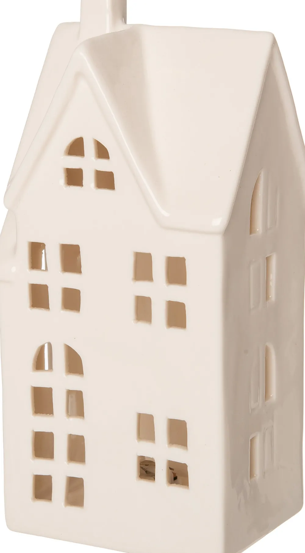 Das kleine Haus ist aus Porzellan gefertigt und hat eine weiße Farbe. Die Maße sind 8,3 x 7 x 17 cm.
