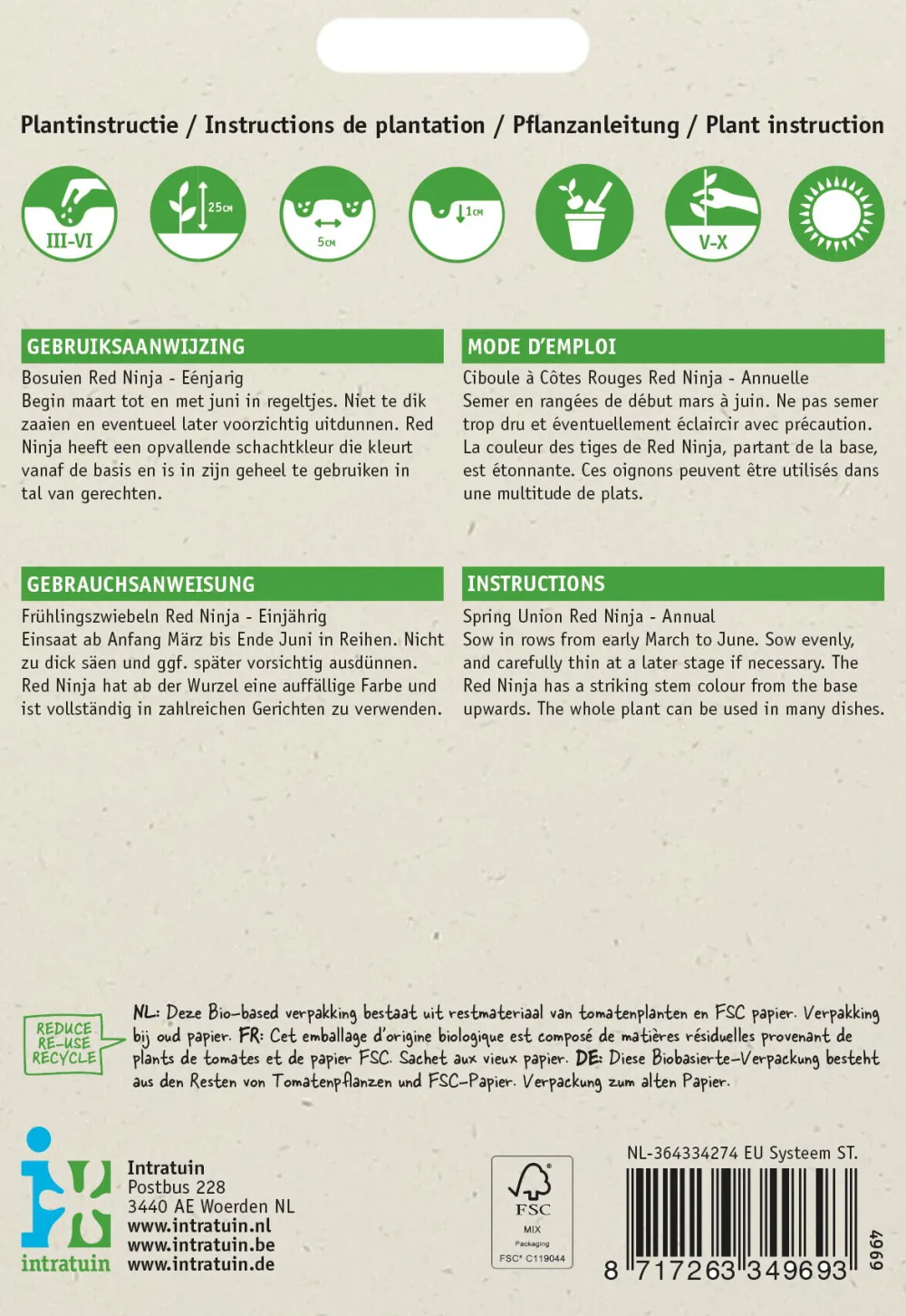 Die Samen der roten Lauch- bzw. Frühlingszwiebel ‚Red Ninja‘ werden ab Mitte April bis Juni im Freien in Reihen gesät, mit einem Pflanzabstand von 15 x 2,5 cm. Nach ca. 60 Tagen kannst du bereits ernten, wenn die Stängel der Frühlingszwiebel etwa 2-3 cm dick sind. Die Frühlingszwiebel-Sorte ‚Red Ninja‘ sieht nicht nur appetitlich aus, sondern ist auch insbesondere wegen ihres milden Geschmacks beliebt. Schön knackig in Rohkost-Salaten oder als Garnitur für warme Gerichte. Aber auch zum Braten, Grillen, Backen und Kochen eignet sich diese Lauchzwiebel und sorgt dabei für einen dezenten Zwiebelgeschmack. ‚Red Ninja‘ wächst mit langen Stängeln, von denen sich sowohl der weiß-rötliche als auch der grüne Teil essen lassen.