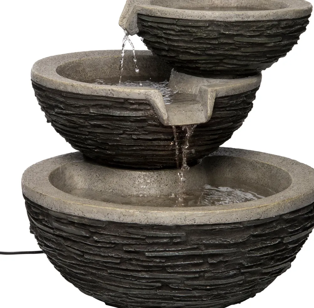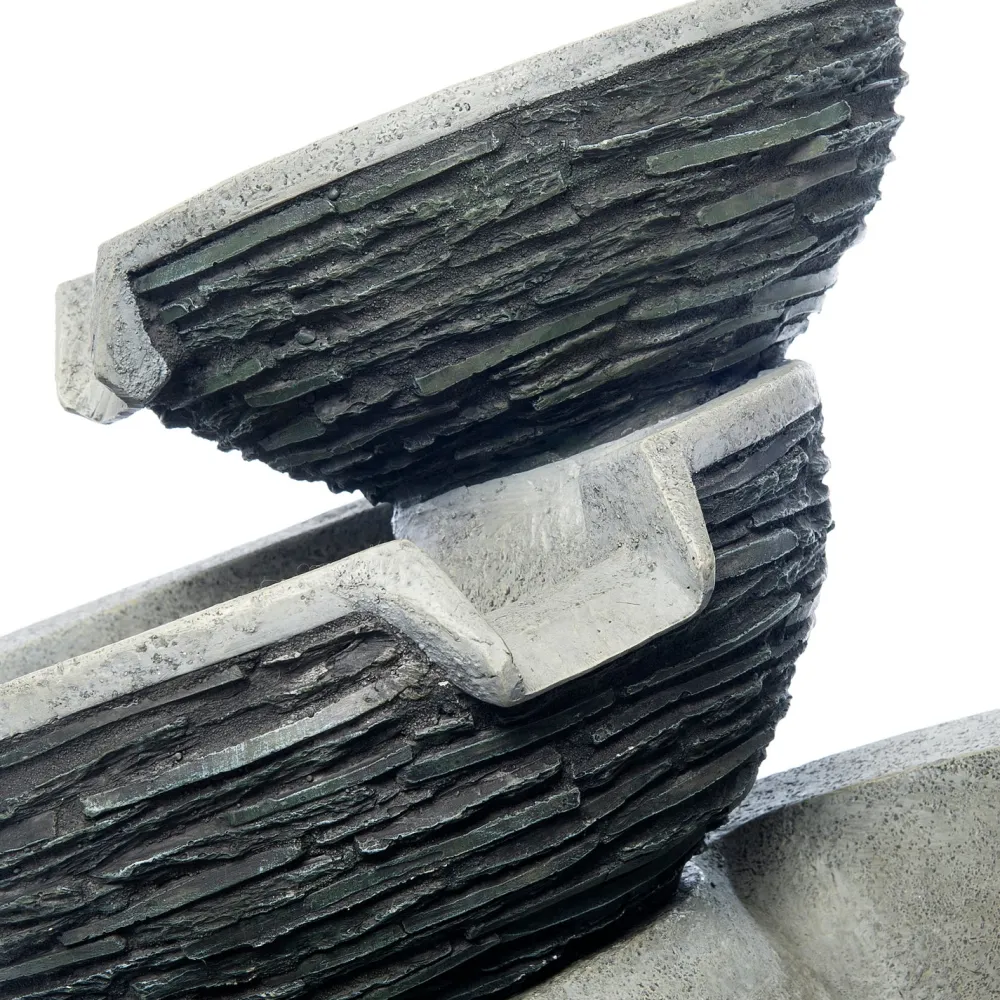 Das Wasserspiel ist mit integrierten LED-Lämpchen in der Farbe Warmweiß beleuchtet. Die Beleuchtung sorgt in den dunklen Abendstunden für eindrucksvolle Effekte. Außerdem ist das Wasserornament mit einer Wasserpumpe (450 l/h) für Niederspannung sowie einem 10 Meter langen Kabel und Adapter ausgestattet. Die Maße des Wasserspiels betragen 40,2 x 35,8 x 60,3 cm.